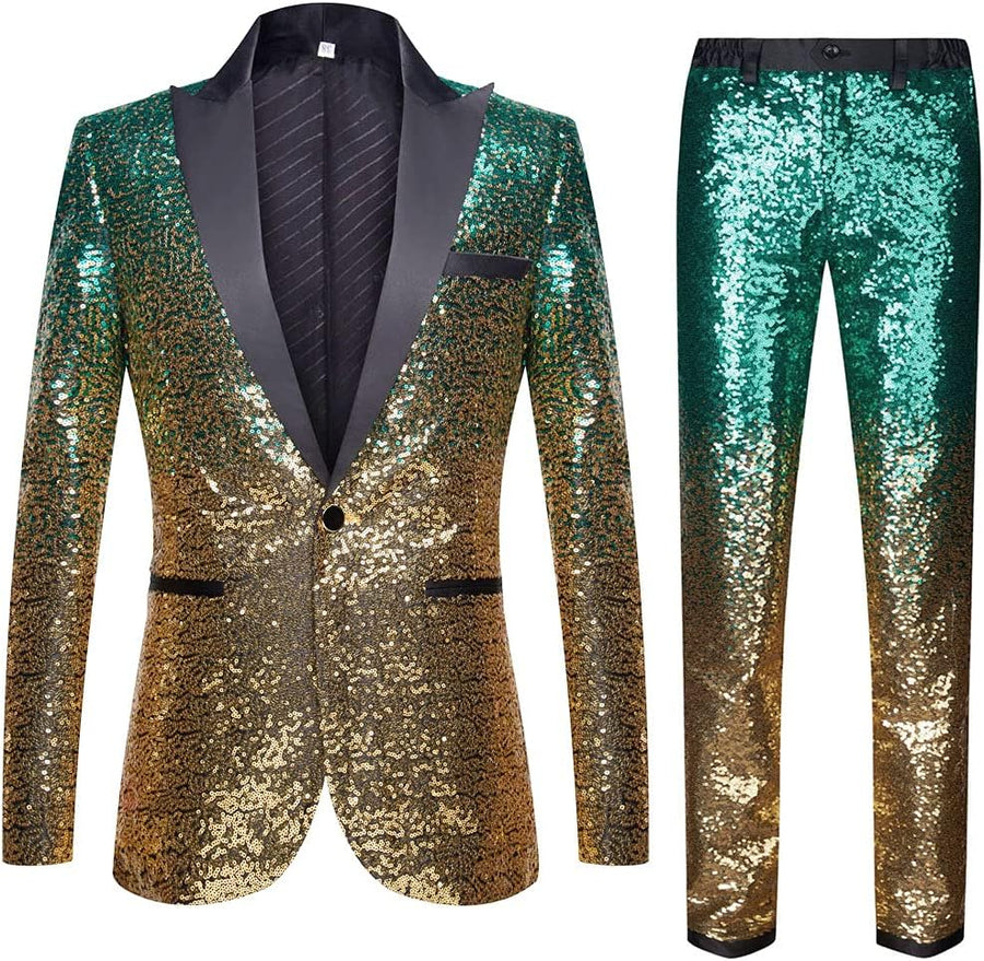 Herren Modische Blumenmuster Pailletten Zweiteiler Set Anzüge, Green Gold