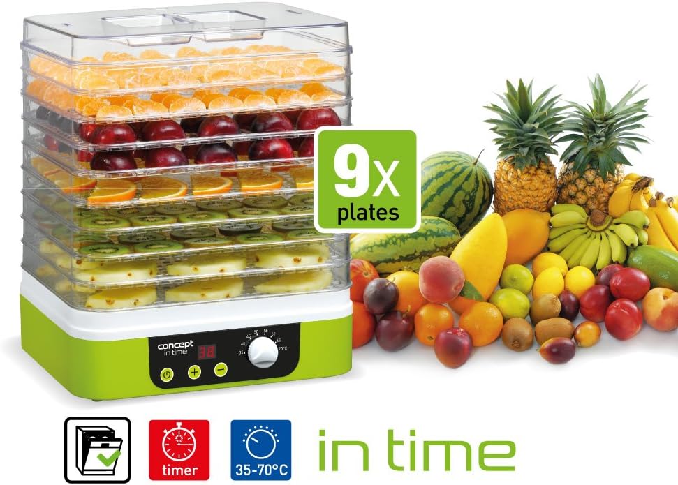 CONCEPT Hausgeräte SO1060 Dörrgerät IN TIME mit Zeitschaltuhr, 9 rechteckige Einlegeböden, grün, Dis