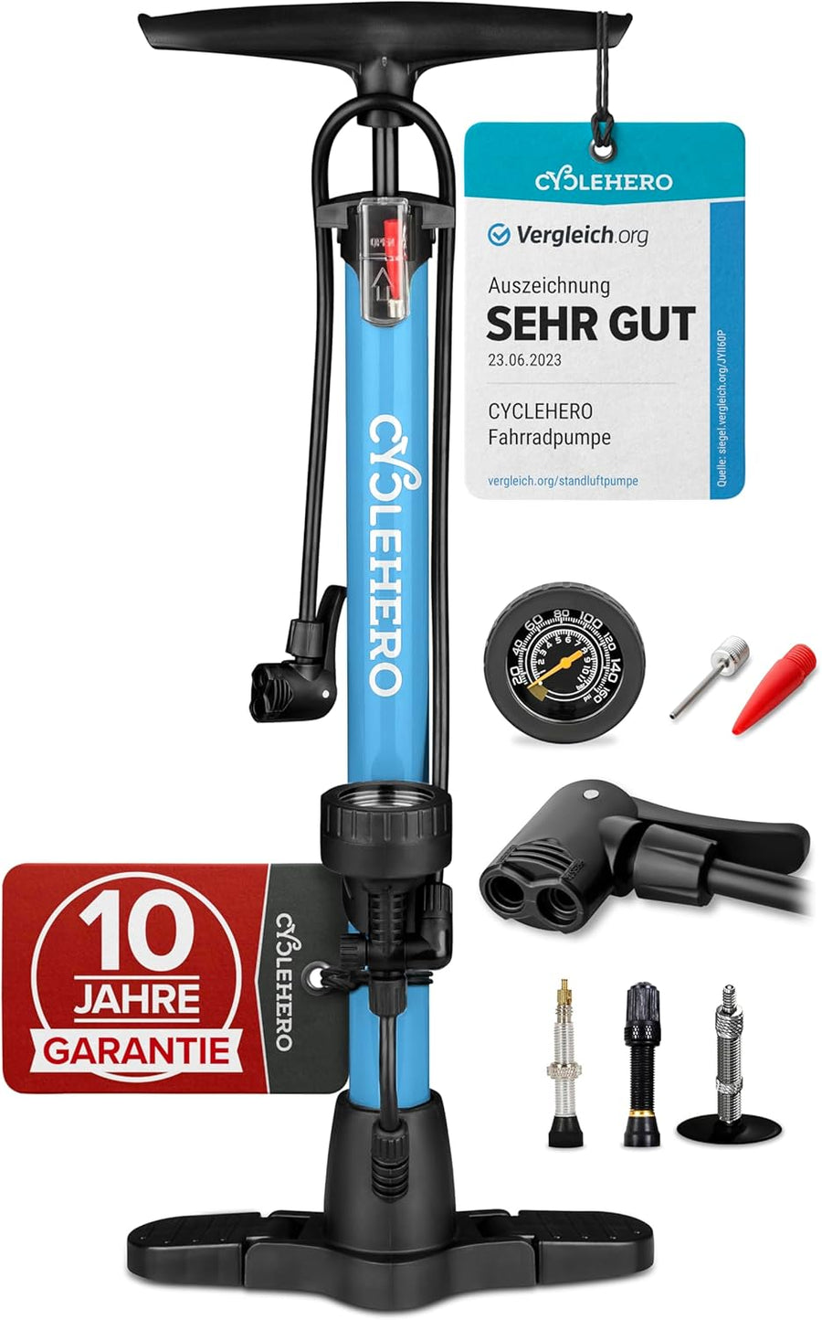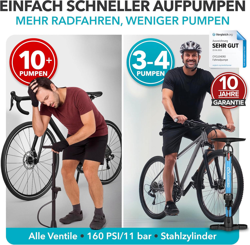 CYCLEHERO Fahrradpumpe für alle Ventile - Leistungsstarke Luftpumpe mit Manometer und 2 Jahren Garan