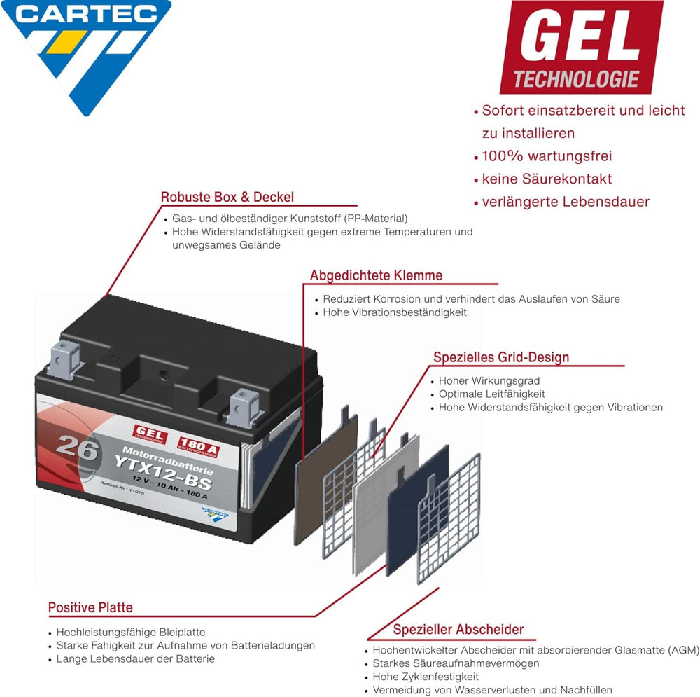 CARTEC Motorradbatterie YTX12-BS, 10Ah, 180A, Gel Technologie Motorrad-Starter-Batterie, Erstausrüst
