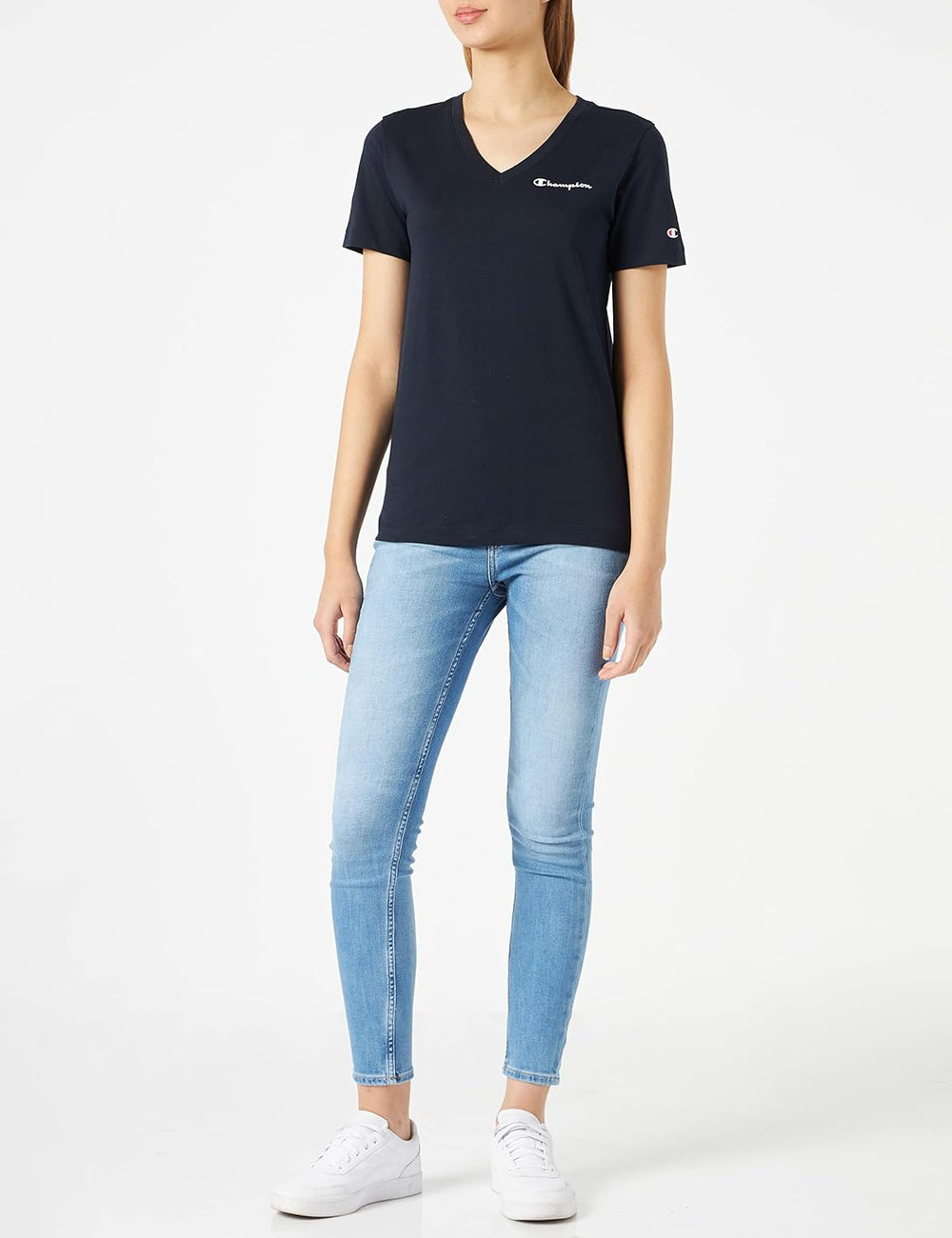 Champion Damen American Classics-Small Logo S/S V-Neck T-Shirt L Blau (Marine), L Blau (Marine)