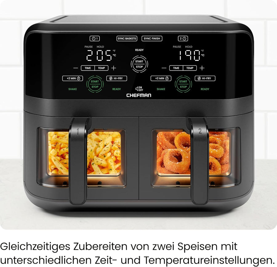 CHEFMAN 5,6 Liter Doppelkorb- Heissluftfritteuse mit Easy-View-Fenster, Sync-Finish, Hi-Fry, automat