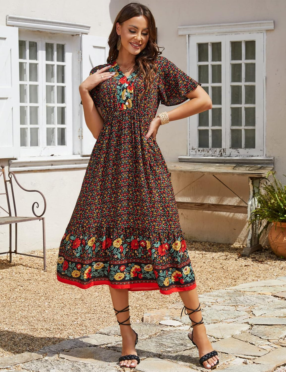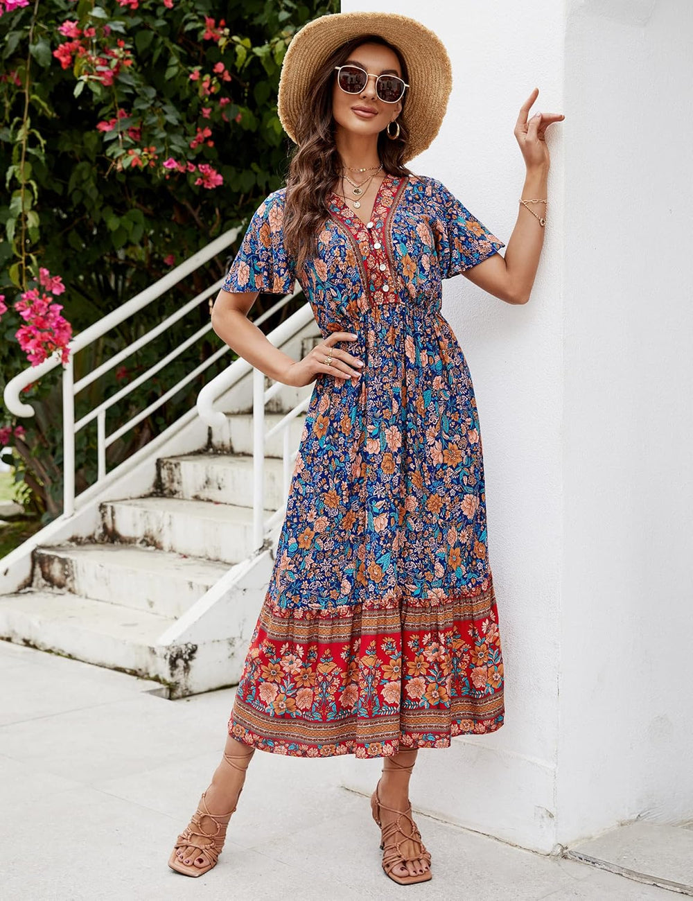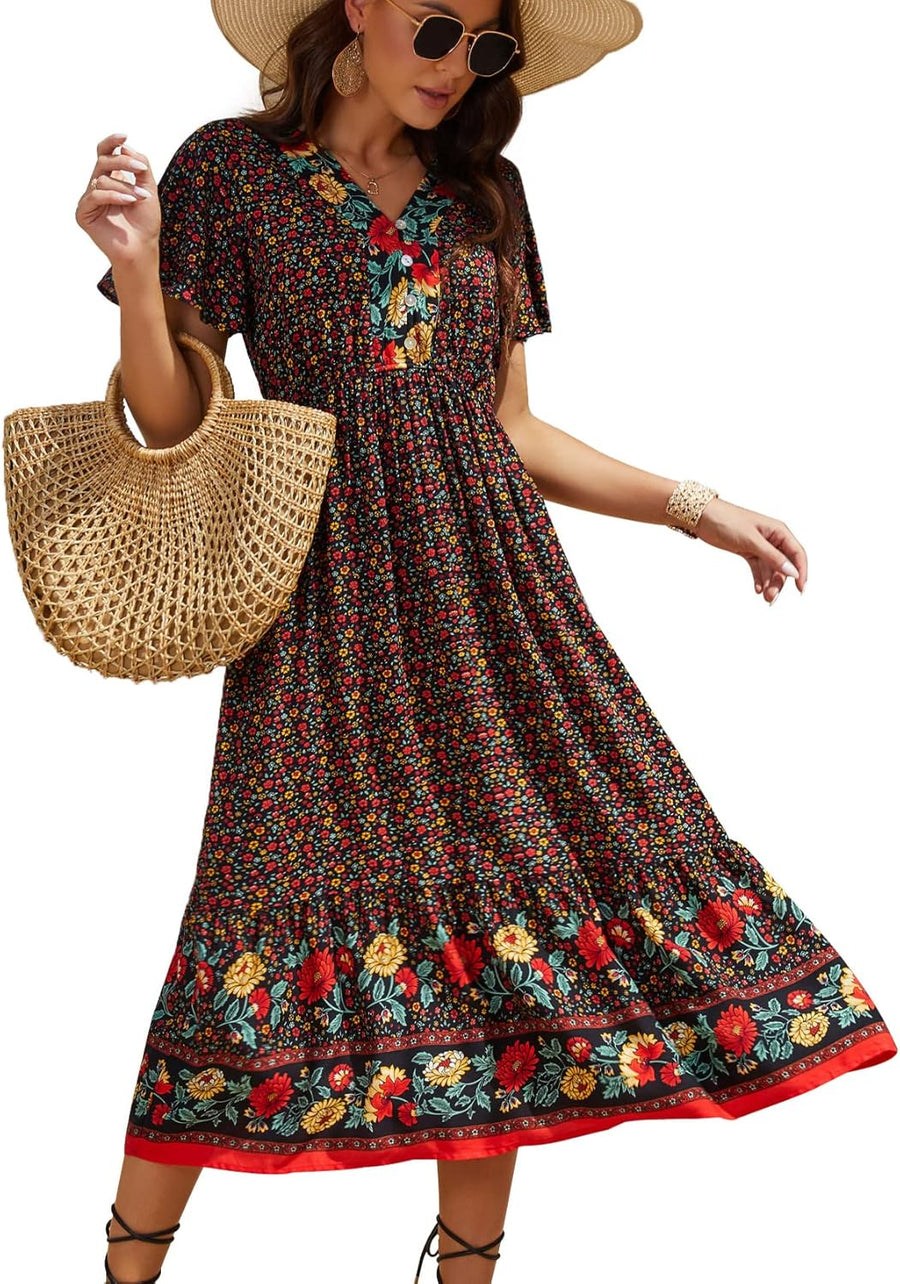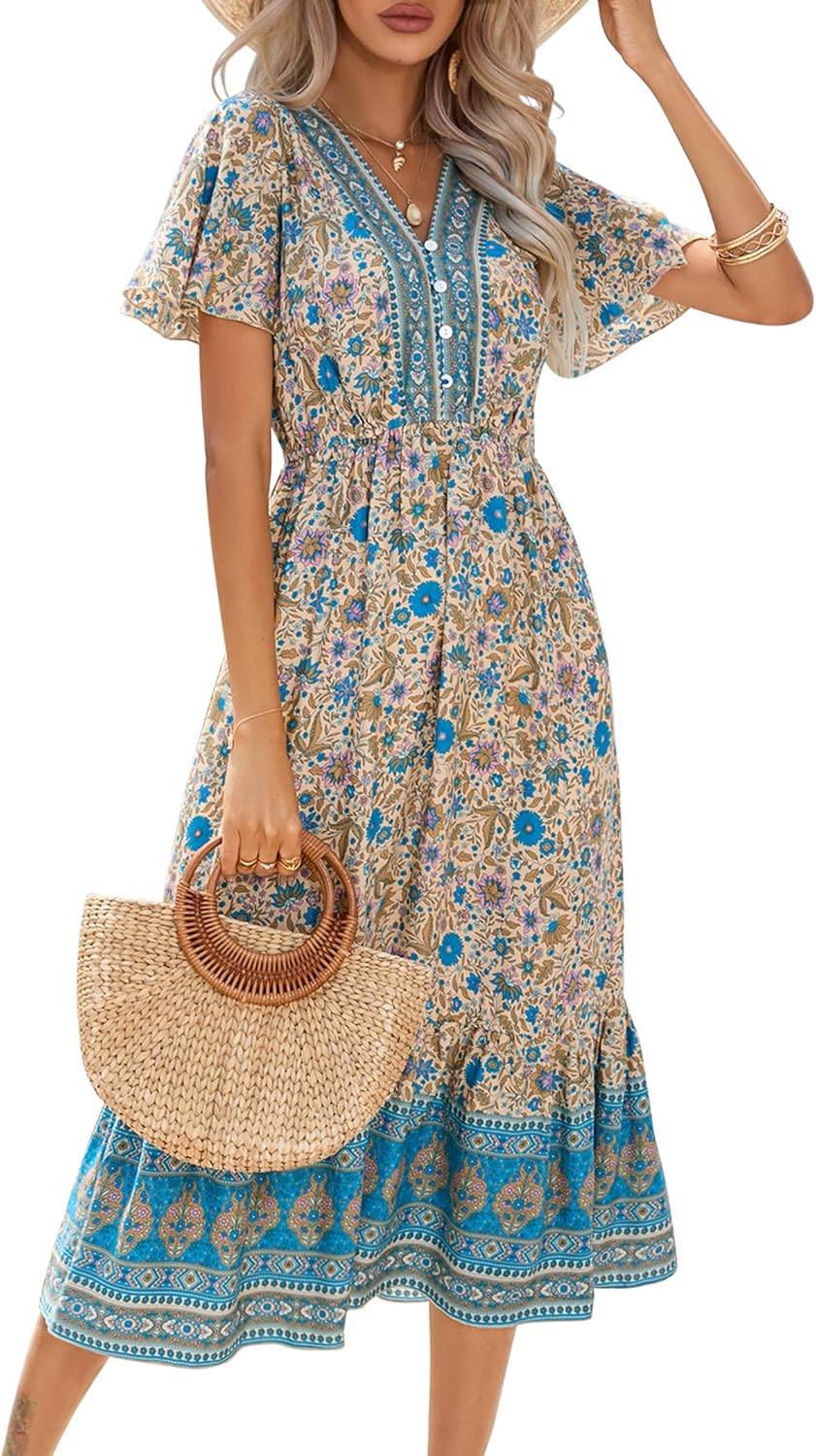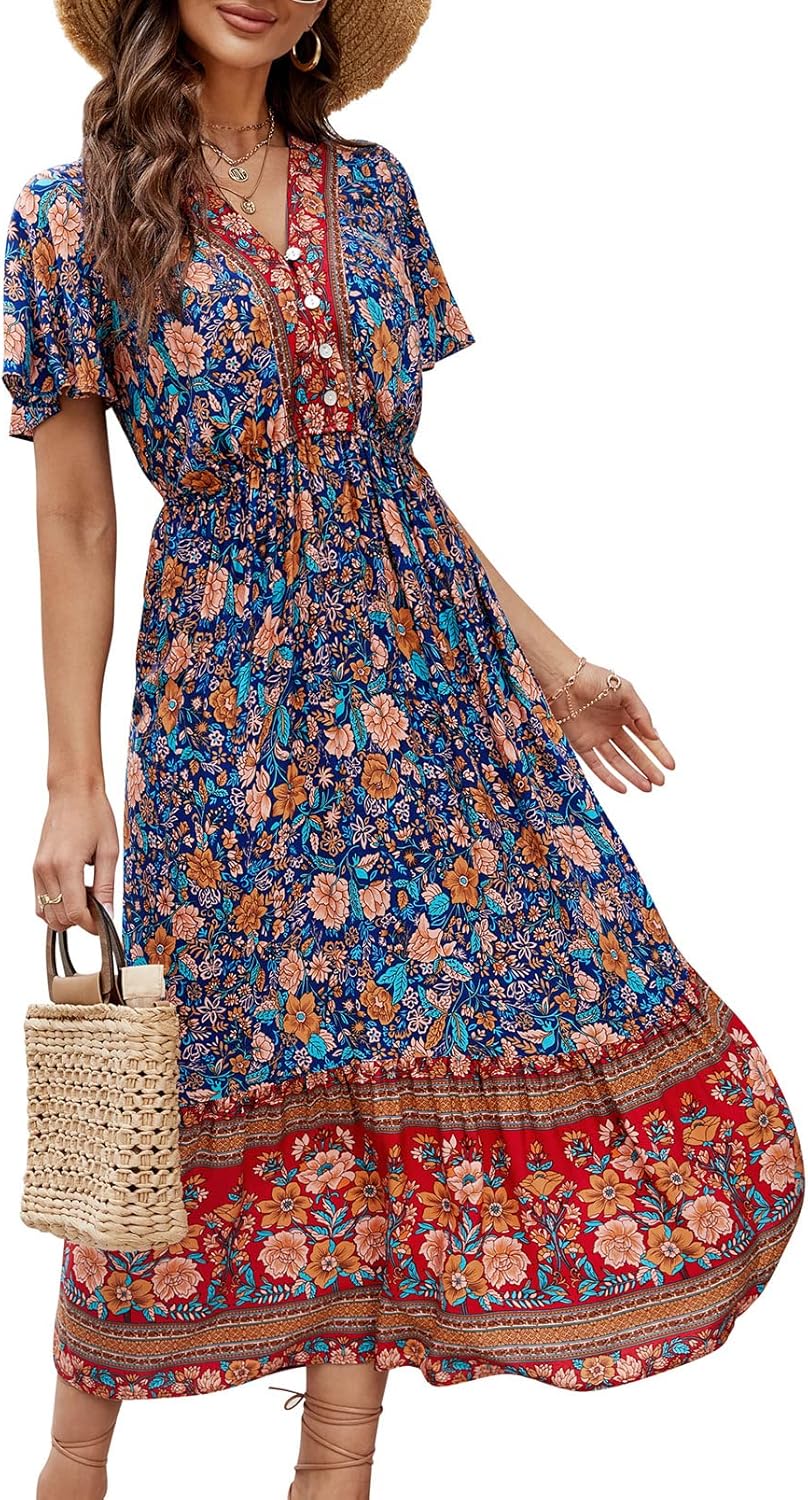 Clearlove Damen Sommerkleid Boho Kurzarm Midi Kleider V-Ausschnitt Strandkleid lang Blumenkleid Rüsc