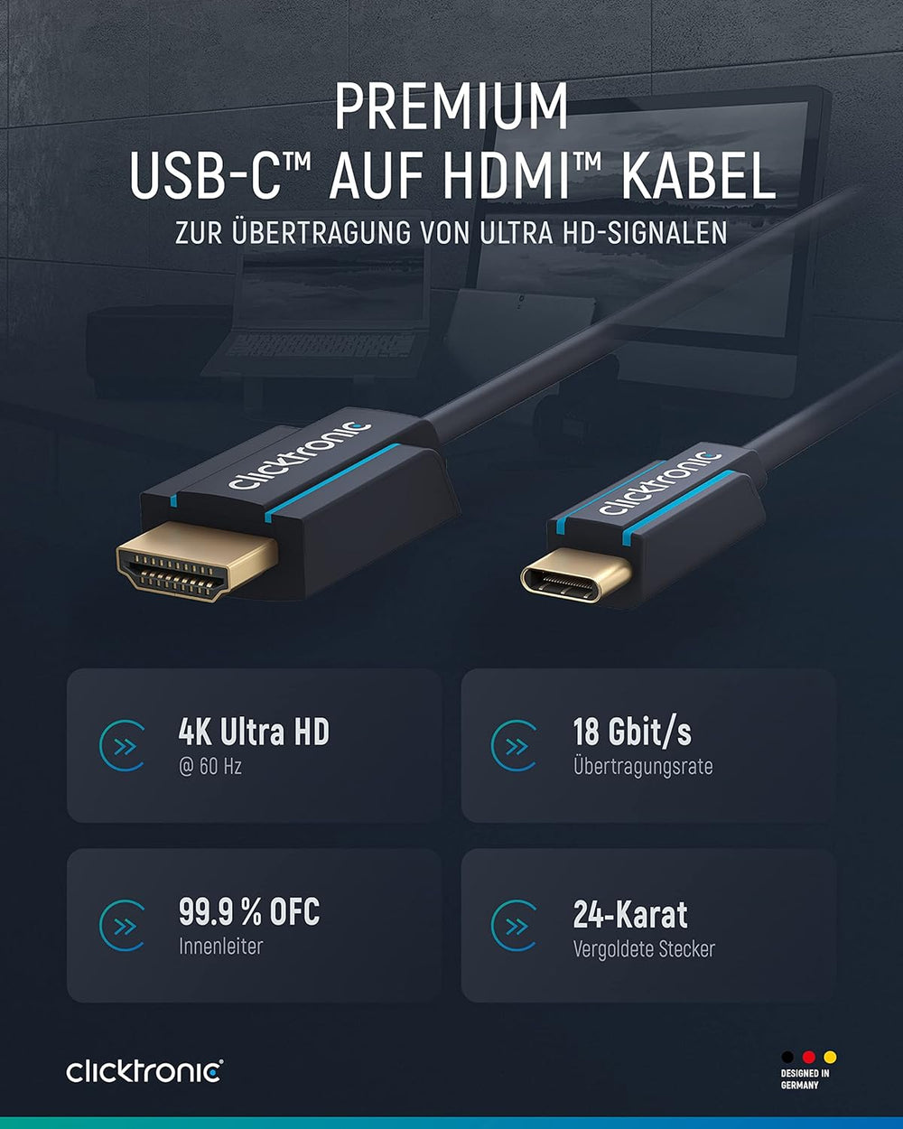 Clicktronic 1m USB C zu HDMI Adapter für TV – USB-C auf HDMI 2.0 Adapterkabel 4K 60Hz - Thunderbolt