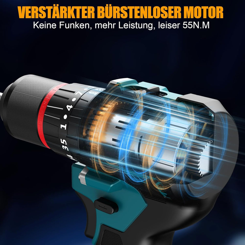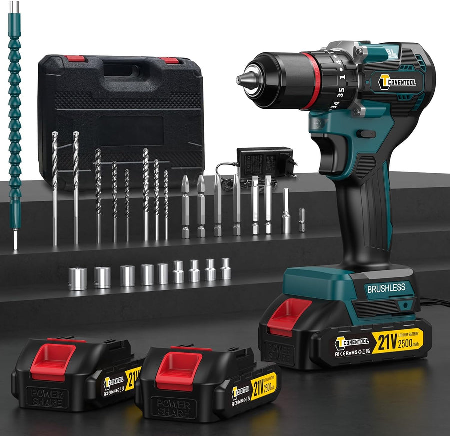 Conentool 21V Bürstenlos Akkuschrauber Set, Akku bohrschrauber mit 2x 2500mAh Akkus, 55 N.m Max schl