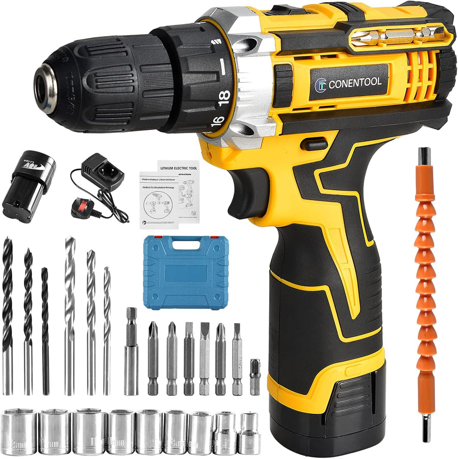 CONENTOOL 18V Akkuschrauber Set, 40N·m Akkubohrer mit 2000mAh Akku, 2-Gang Max.1500rpm, 3/8" (10mm)
