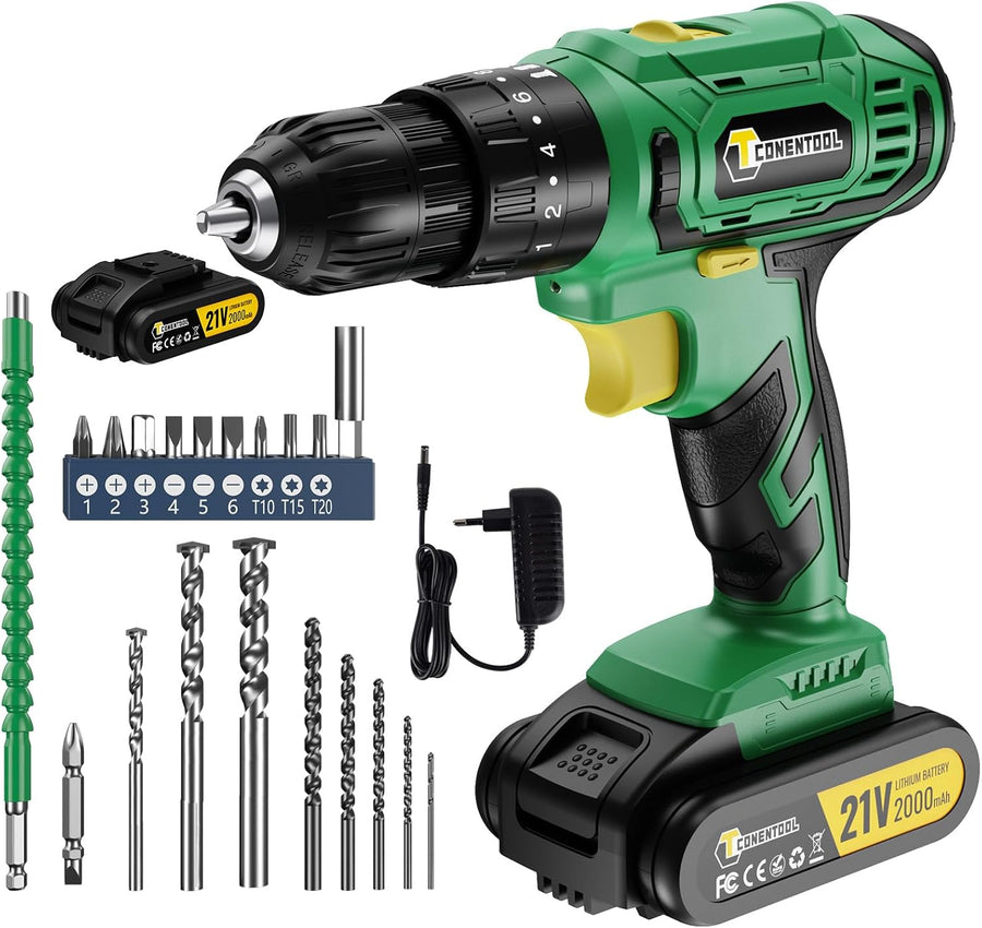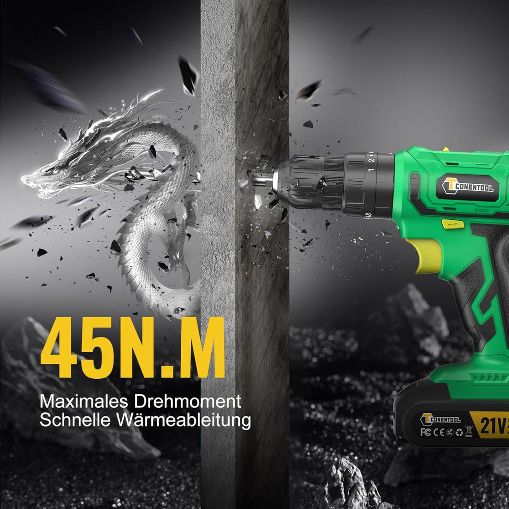 CONENTOOL 21V Akkuschrauber Set, Akku bohrschrauber mit 2000mAh Akkus, 45 N.m Max schlagbohrschraube