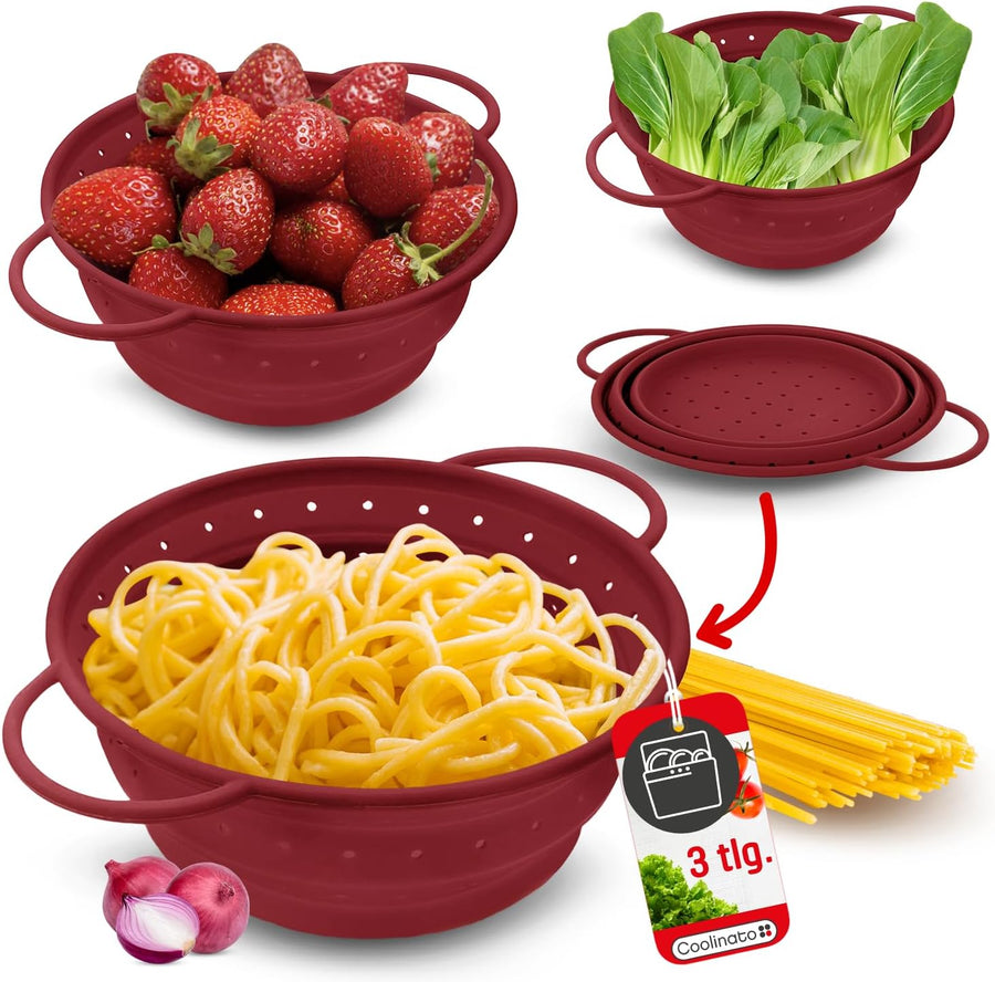 Coolinato Sieb aus Silikon 3er Set, faltbar spülmaschinenfest, Nudelsieb Abtropfsieb Dampfgar Einsat