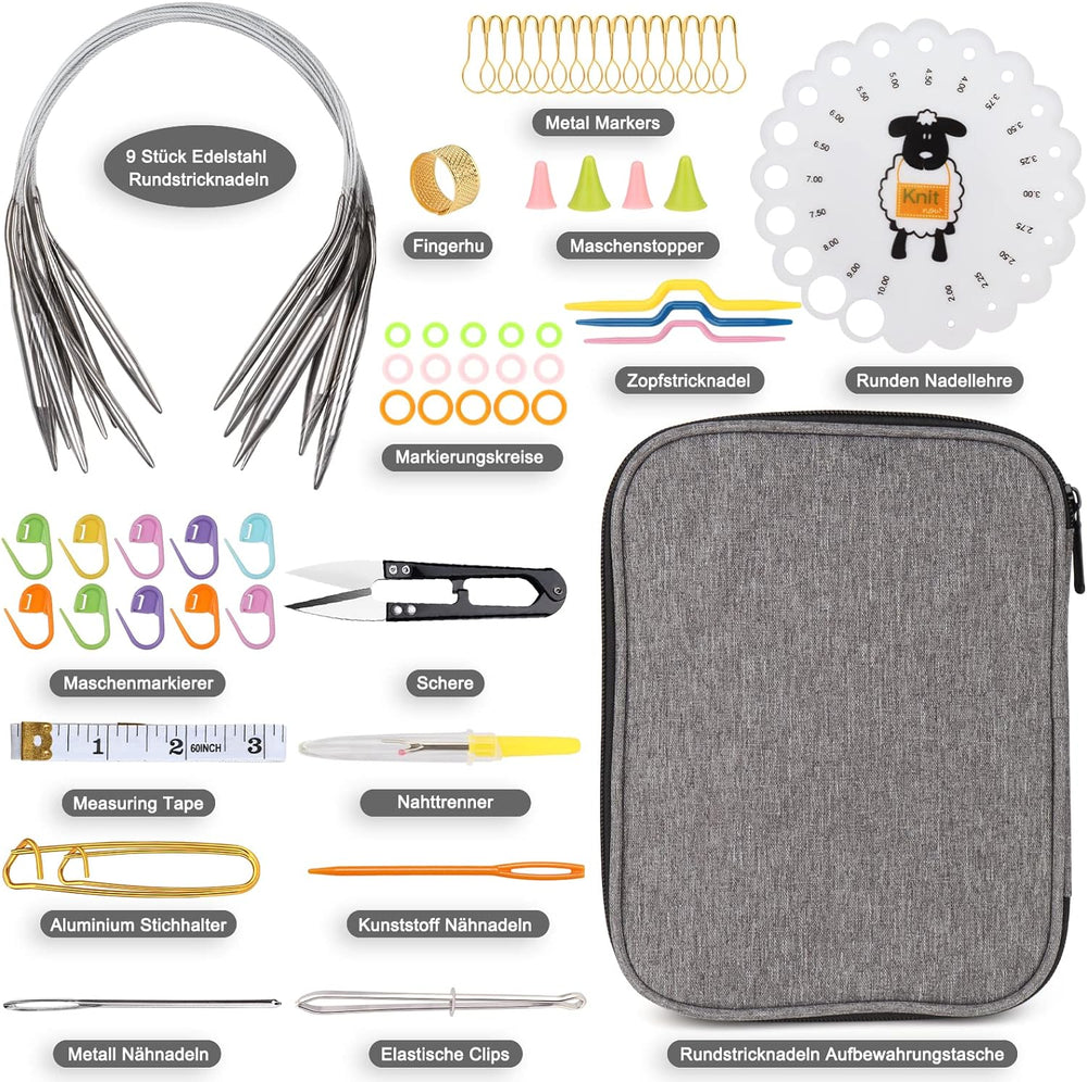 Coopay Rundstricknadeln Set mit Lose-Blat Tasche, 9 Stück Edelstahl Stricknadeln Rundstricknadel 80