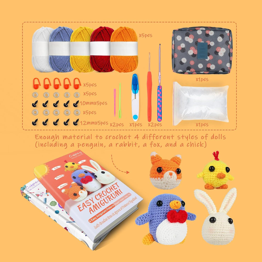 Coopay Häkelset für Anfänger: 4 in 1 Niedlich Häkelset Tiere - Pinguin, Küken, Kaninchen & Fuchs, Ko