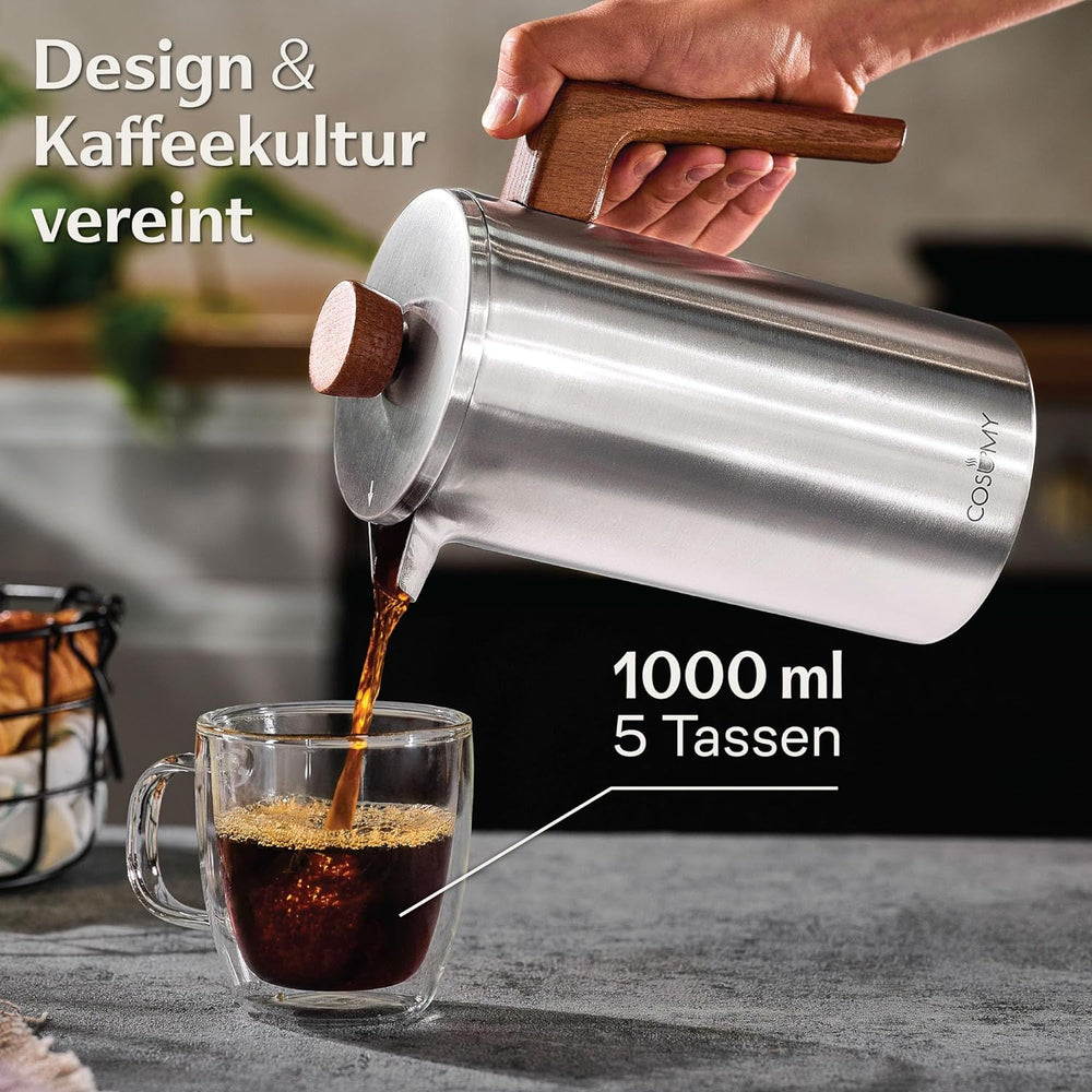 Cosumy French Press aus Edelstahl und FSC Holz - 1 Liter - Doppelwandige Thermo Isolierung - Grosse