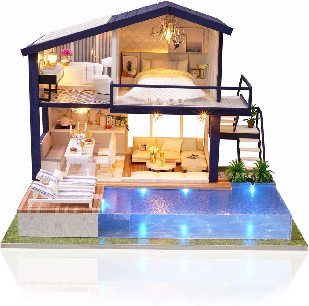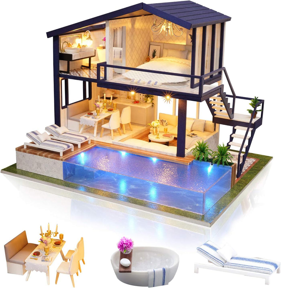 Cuteefun DIY Miniatur Puppenhaus Meer Kit zum BAU Miniatur Haus mit Staubdichten Möbeln und Werkzeug