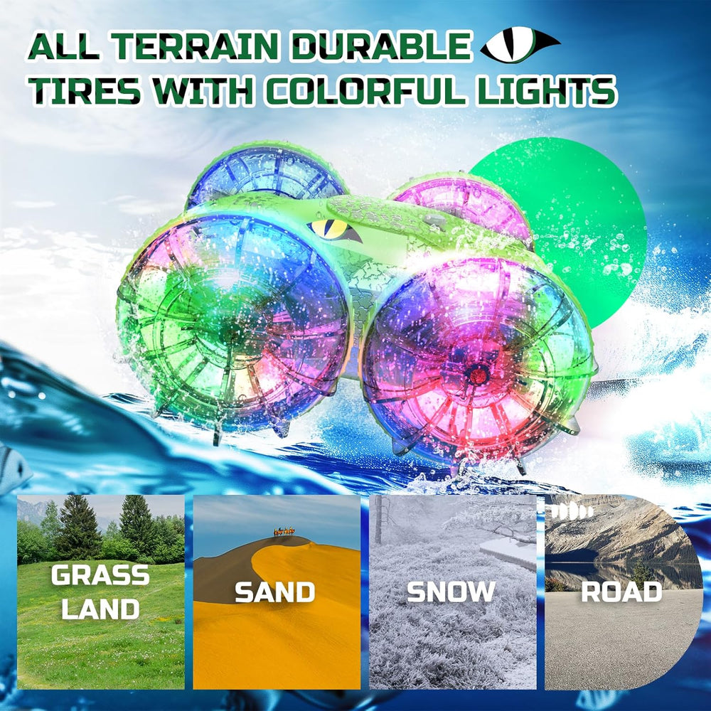 DEERC Amphibisches Ferngesteuertes Auto-Boot mit LED-Lichtern, 4WD Krokodil RC Stunt Car 40 Minuten,