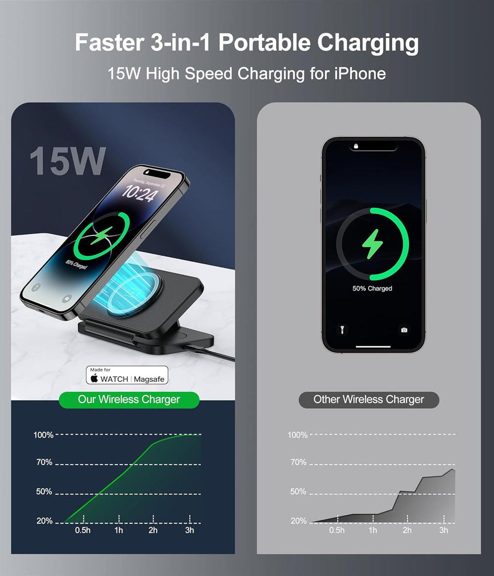 3 in 1 Mag-Safe Kabelloses Ladegerät, 15W Faltbar Induktive Ladestation Für iPhone 15/14/13/12 Serie