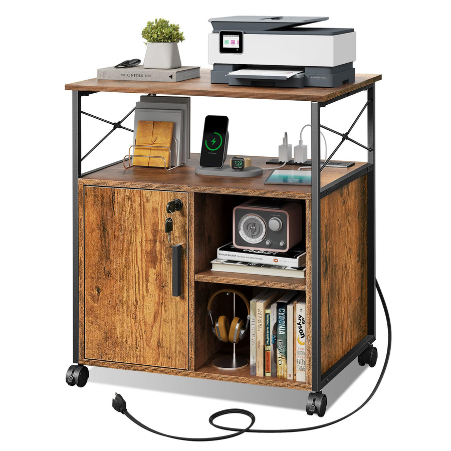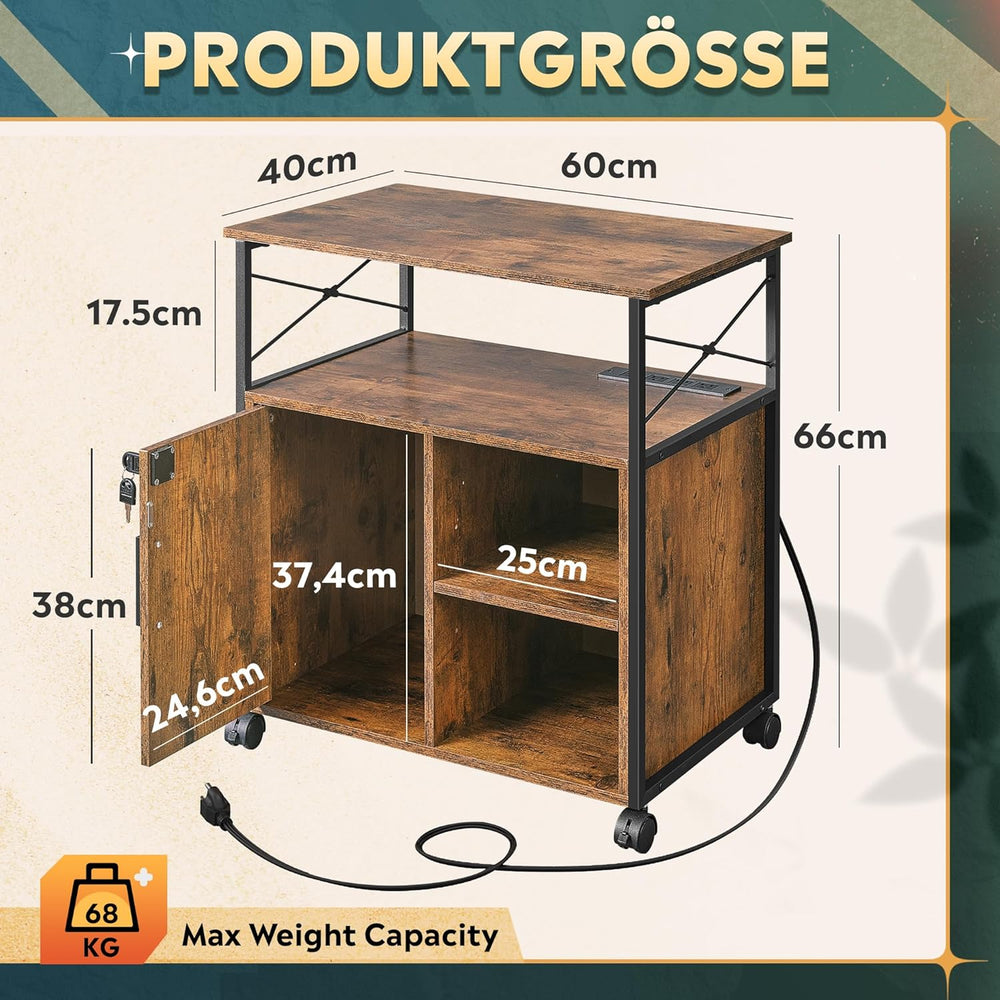 DEVAISE Druckertisch mit Ladestation, Rollcontainer mit Rollen und offenen Ablagen, Druckerschrank a