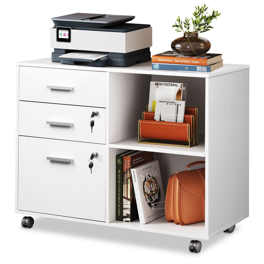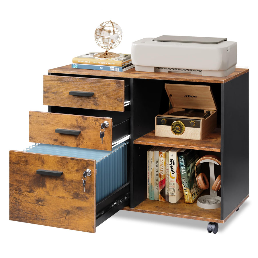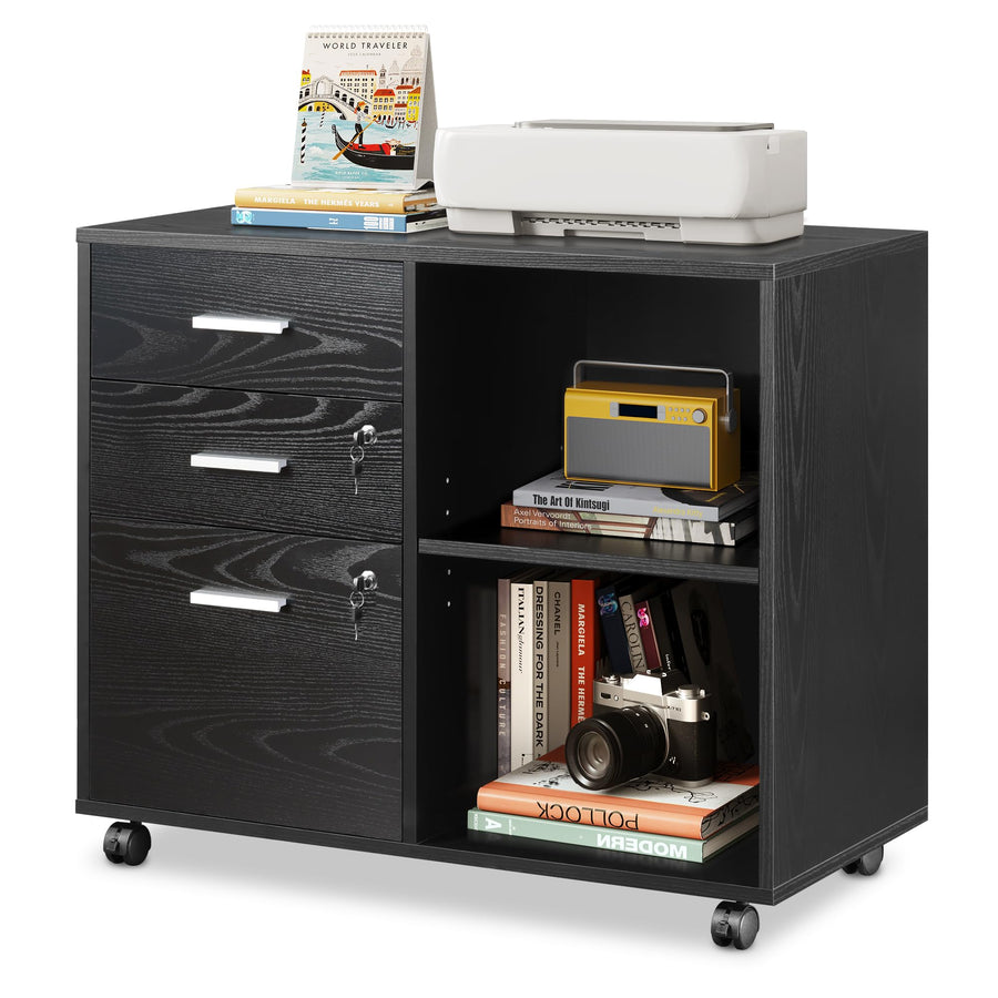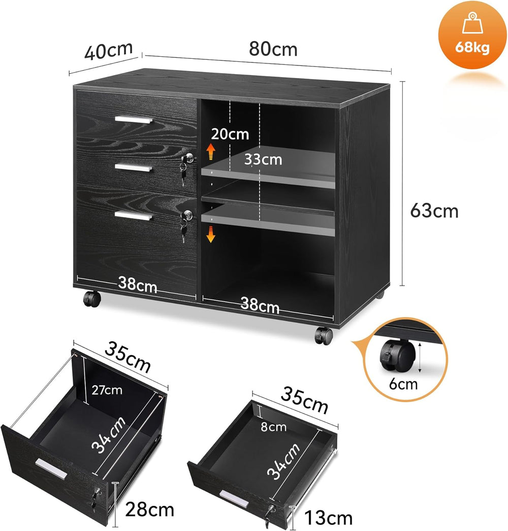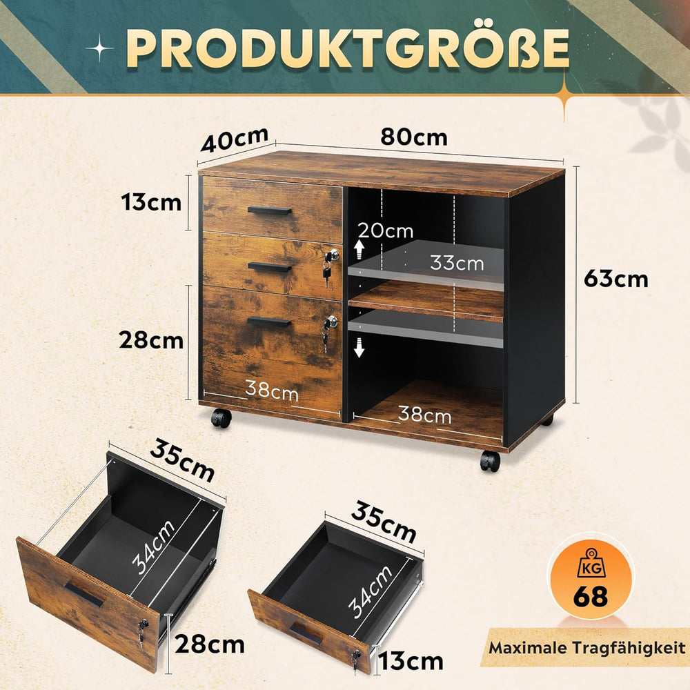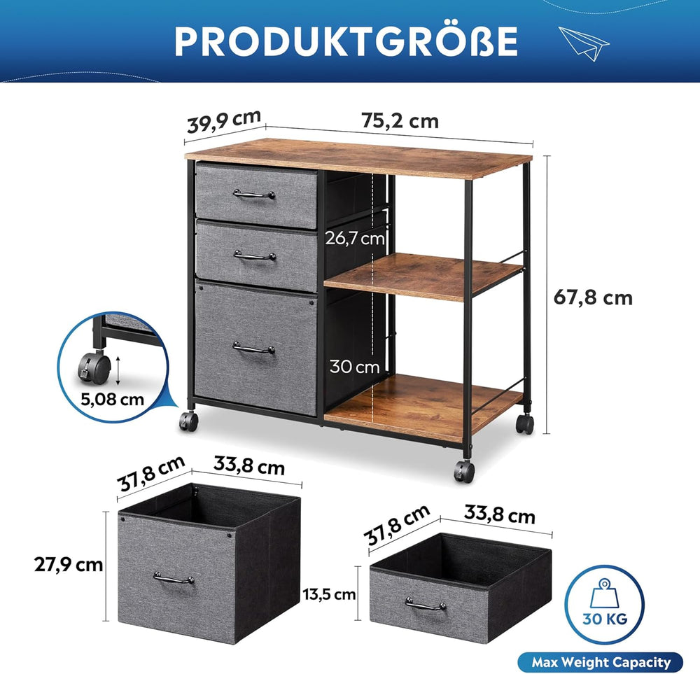 DEVAISE Rollcontainer mit 3 Schubladen und offenen Ablagen, Mobiler Aktenschrank mit Rollen, Drucker