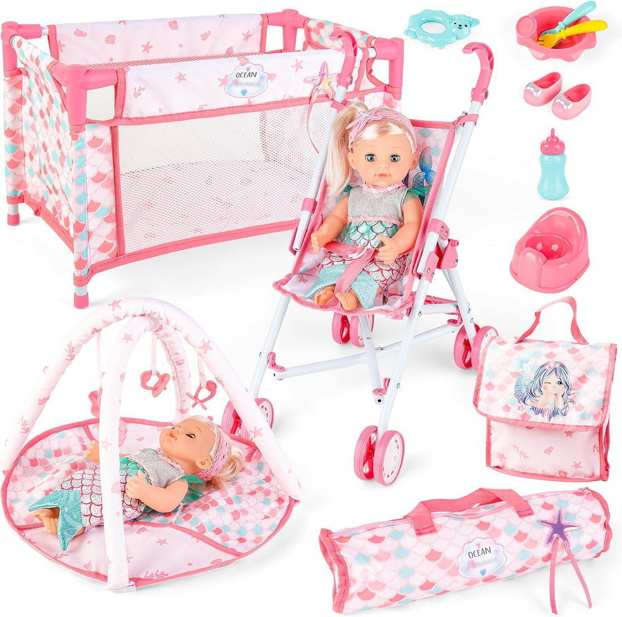 deAO Puppen Set, Baby Puppe Zubehör Set Babypuppe Rollenspielset mit 12” Puppe, Puppenkleidung, Reis