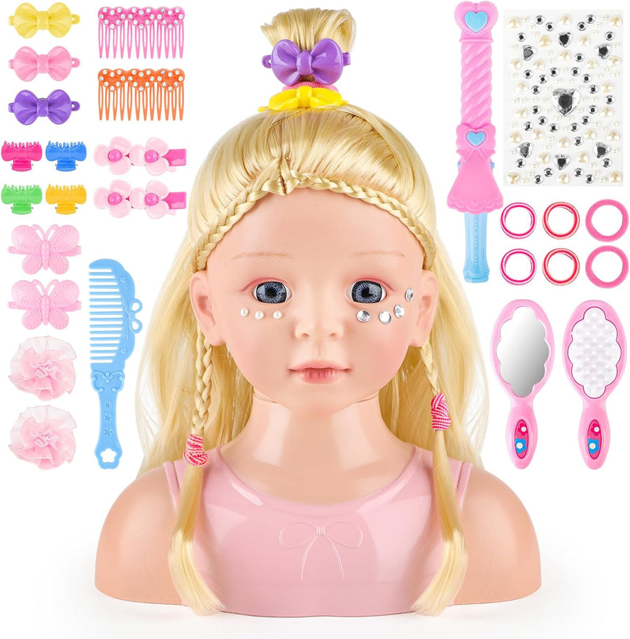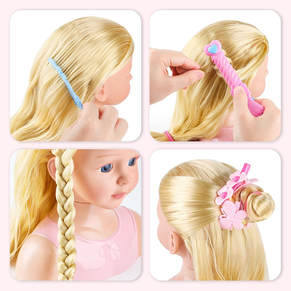 deAO Schminkkopf & Frisierkopf Kinder 23cm – Schminkpuppe mit Blonden Haaren, Schminke und Zubehör S