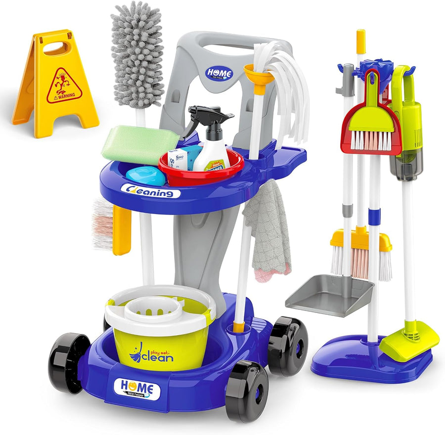 deAO Kinder Putzwagen ab 2 3 4 Jahre mit Wischmop, Eimer, Besen, Staubsauger, Bürsten, Kehrschaufel,