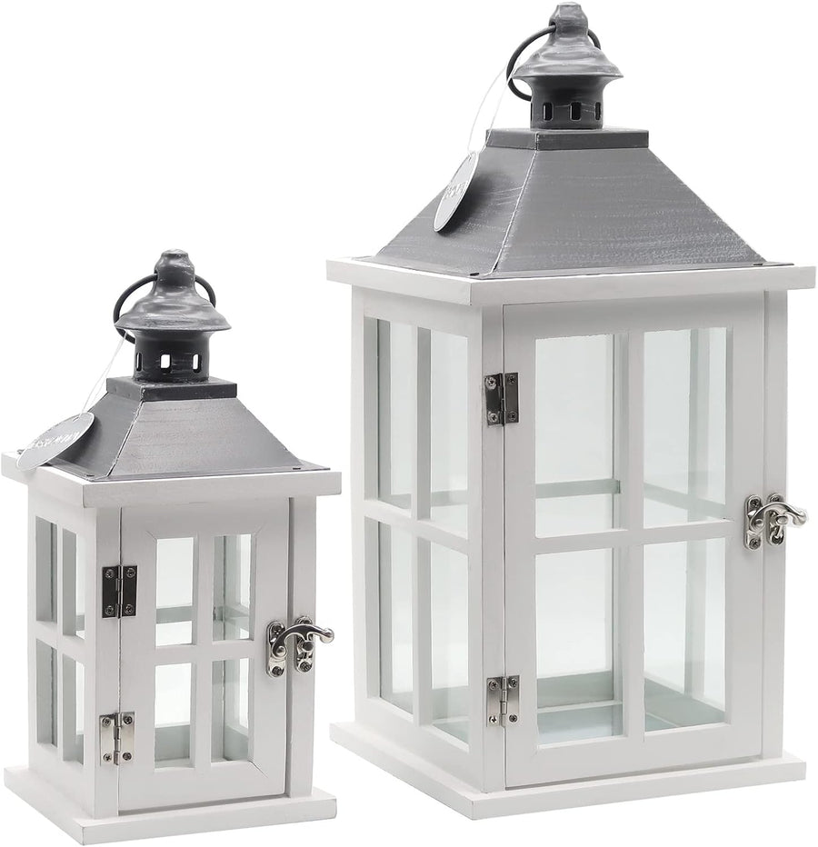 Dekovita 2er-Set Gartenlaterne 27cm/40cm - Holz-Laternen in Weiss mit Glas-Scheiben Henkel Deko-Late
