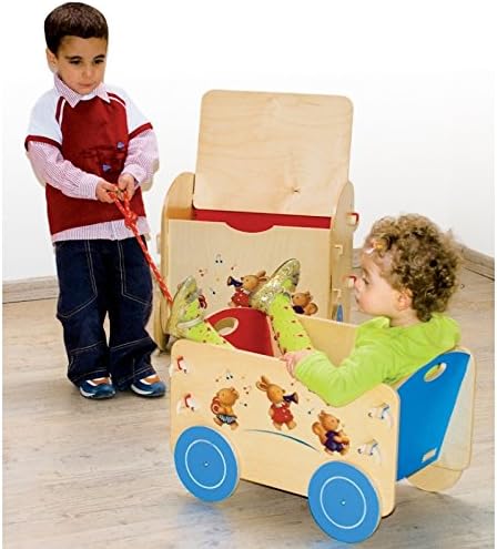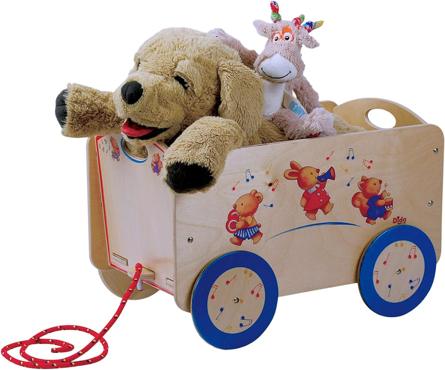 Dida - Holzwagen mit Rädern für Gegenstände und Kinderspielzeug. Dekoration: musizierende Tiere. Lei