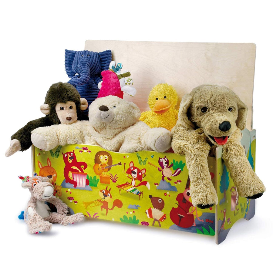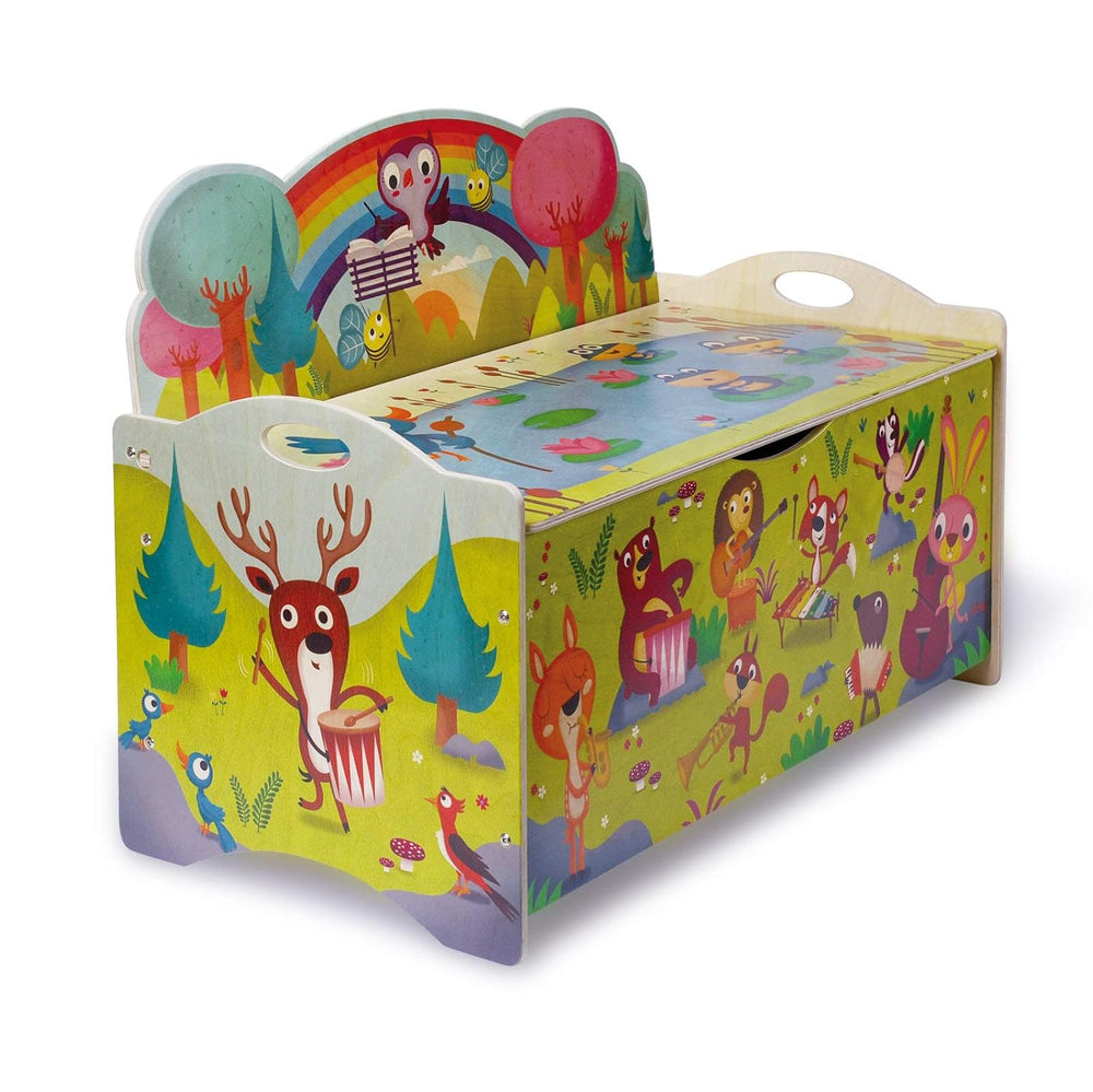 Dida - Sitztruhe mit Platz für Spielzeug aus Holz für Kinder - Dekoration: Tierkonzert im Wald Gross