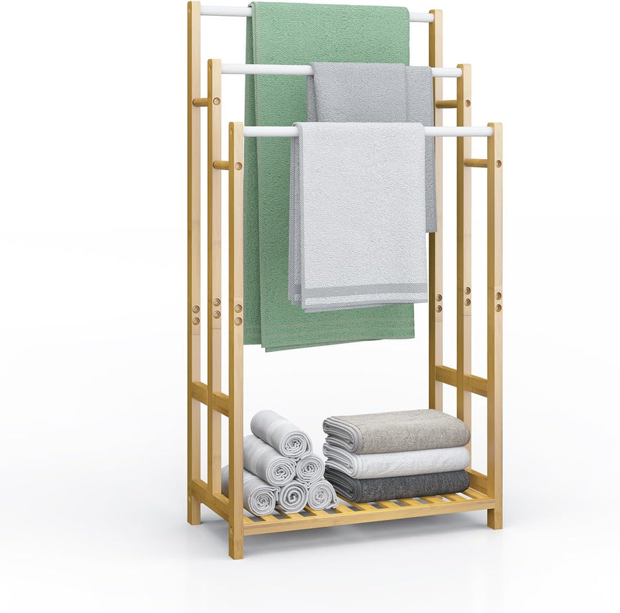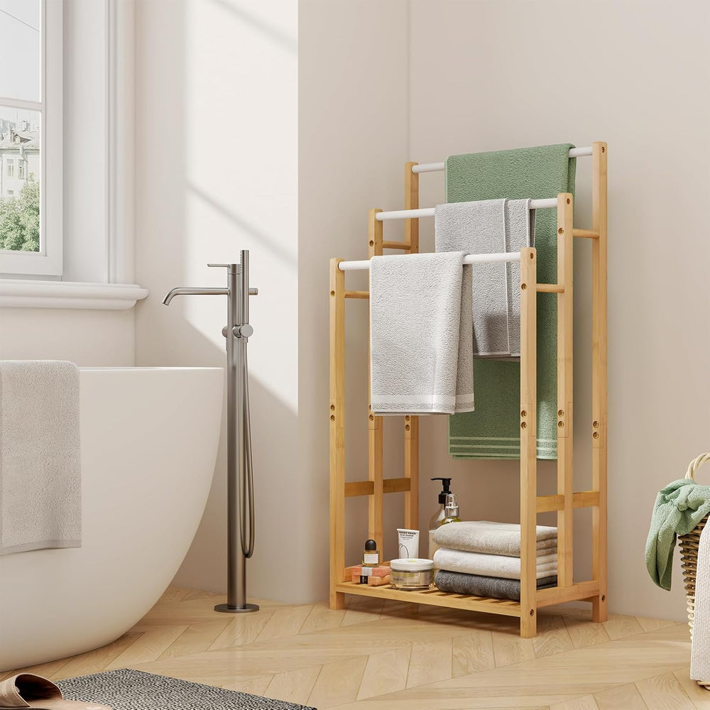 Dripex Freistehender Handtuchhalter Bambus Höhe 86 cm Handtuchständer Badetuchhalter mit 3 Edelstahl