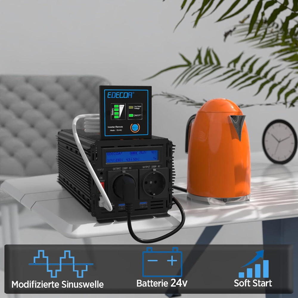 EDECOA Wechselrichter 2000w 24v 230v Spannungswandler mit Neuer Fernbedienung 2X USB und Bildschirm