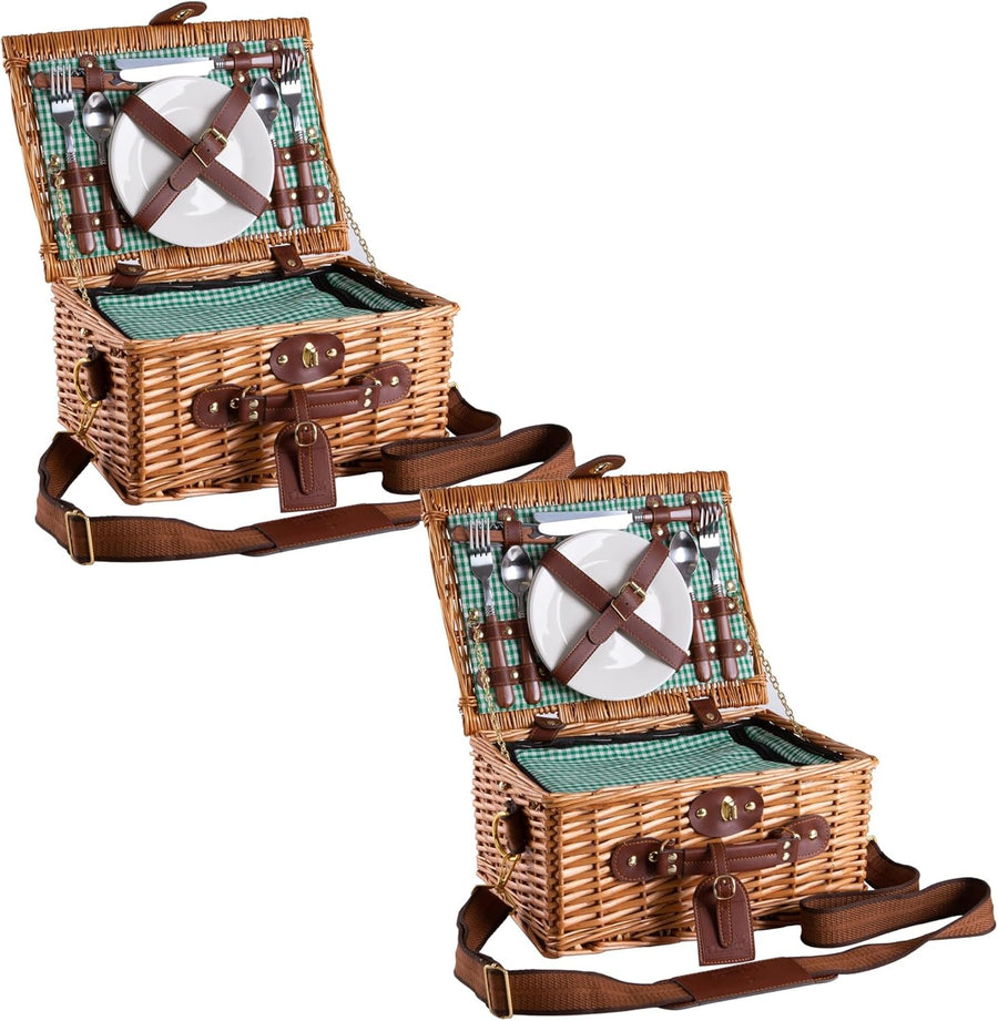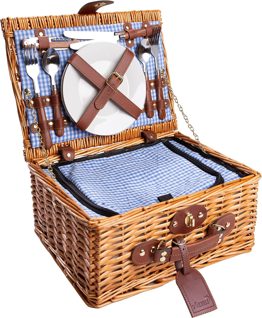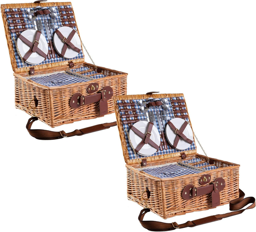 eGenuss 2er-Set handgefertigter Picknickkorb für 4 Personen mit abnehmbarem Schultergurt, Kühlfach,