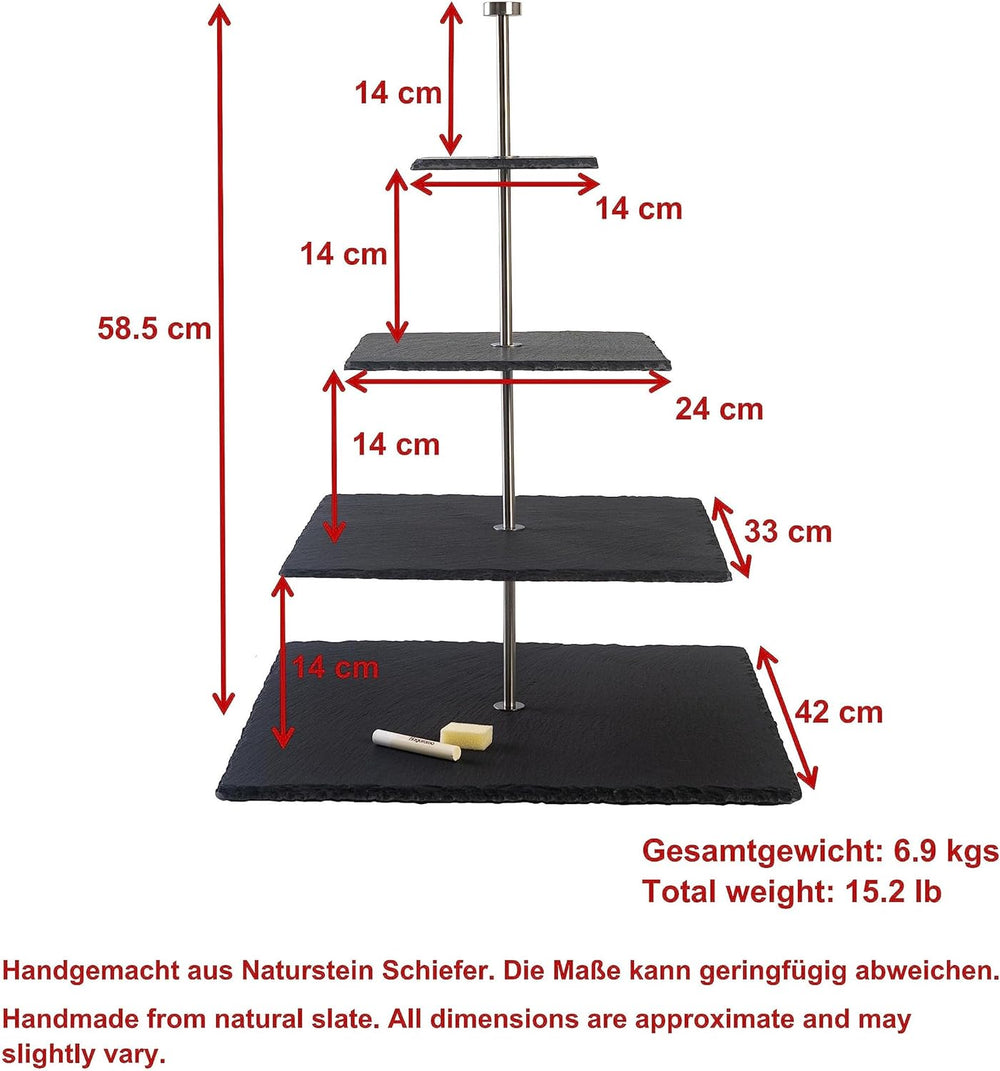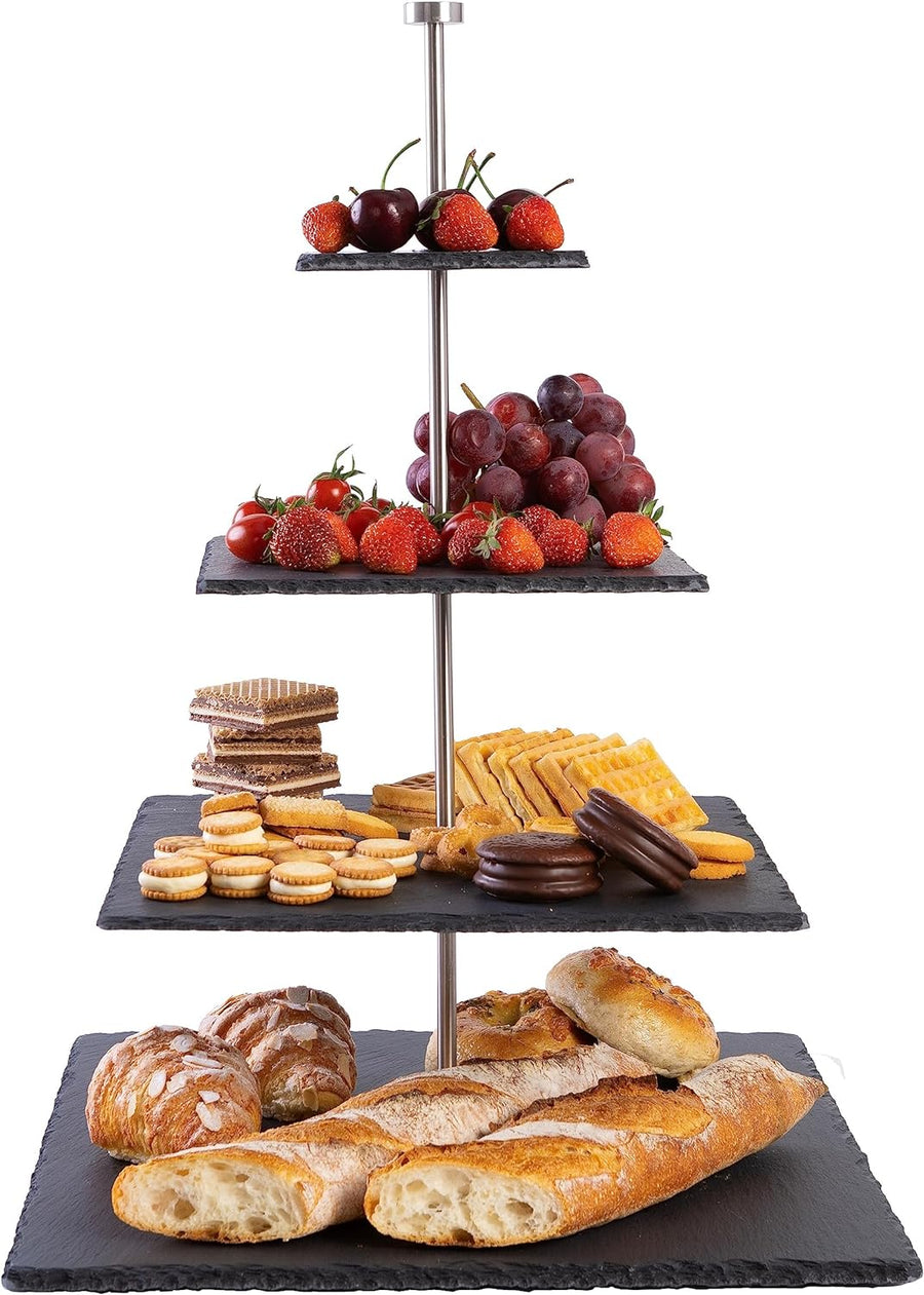 eGenuss 1er-Set Moderne 4-stöckige Etagere mit Edelstahlstange und eckige antrazite Schieferplatten