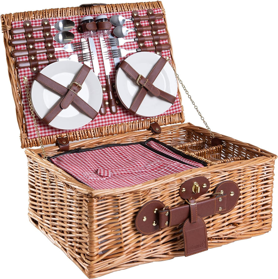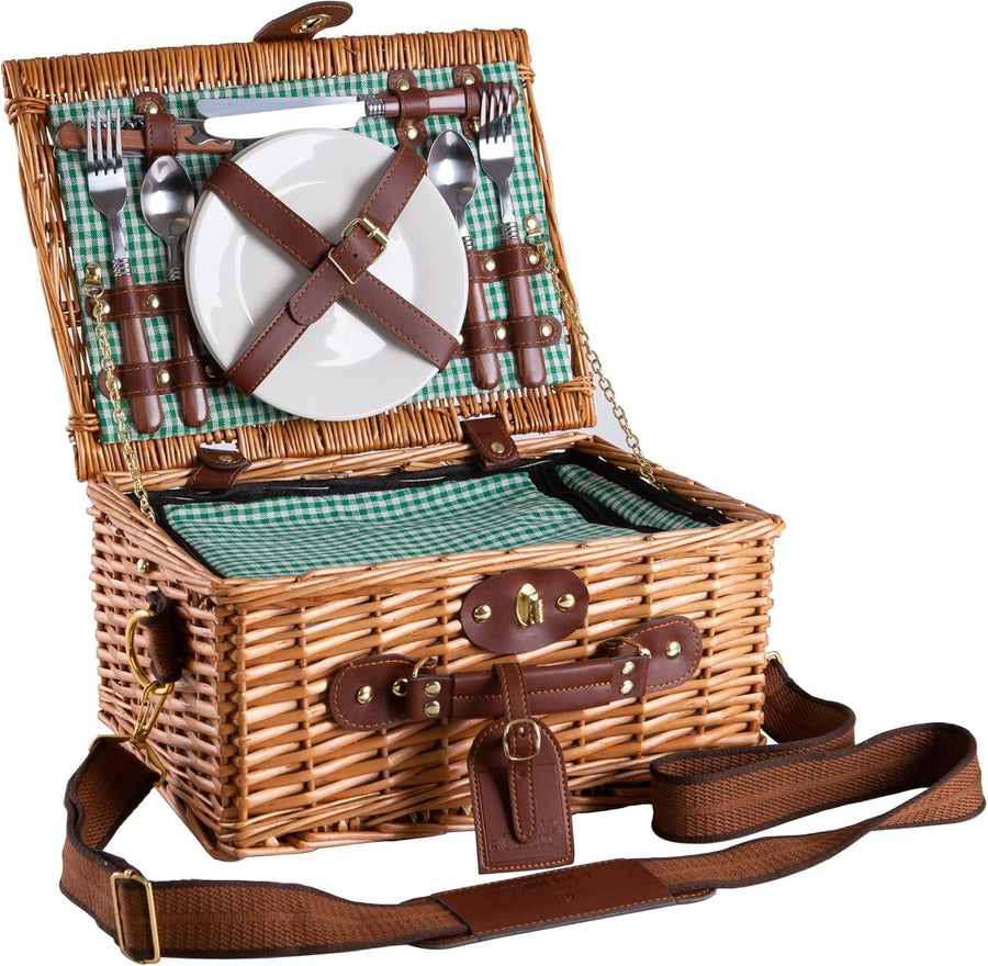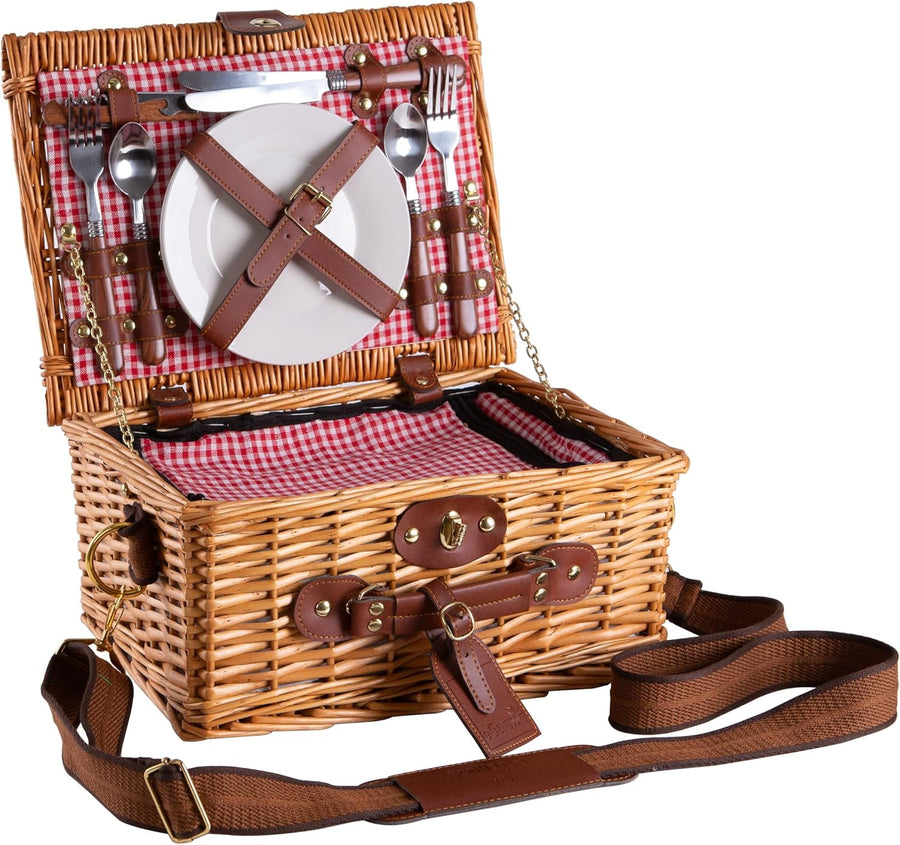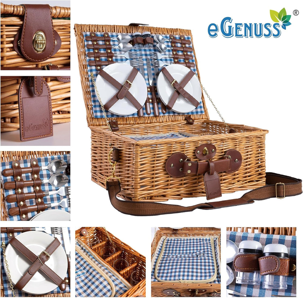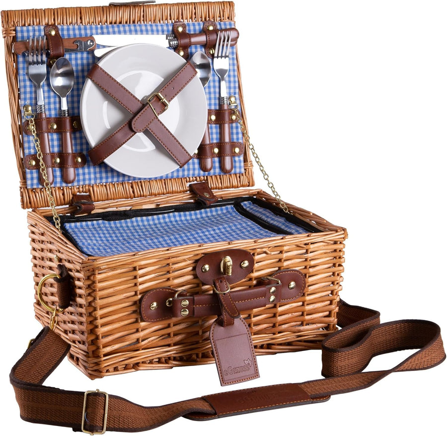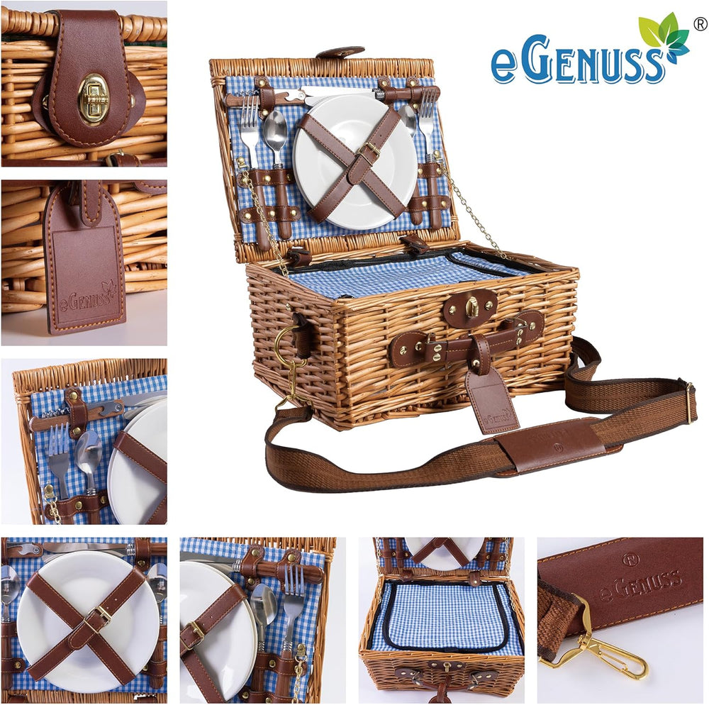 eGenuss Handgefertigtes Picknickkorb für 2 Personen mit abnehmbarem Schultergurt, Kühlfach, Kellnerm