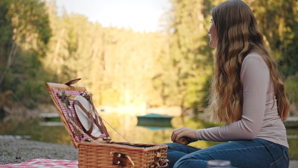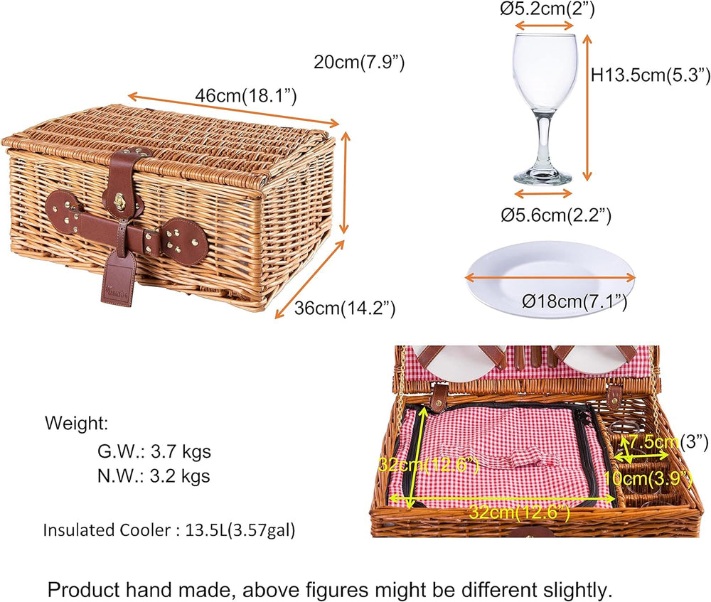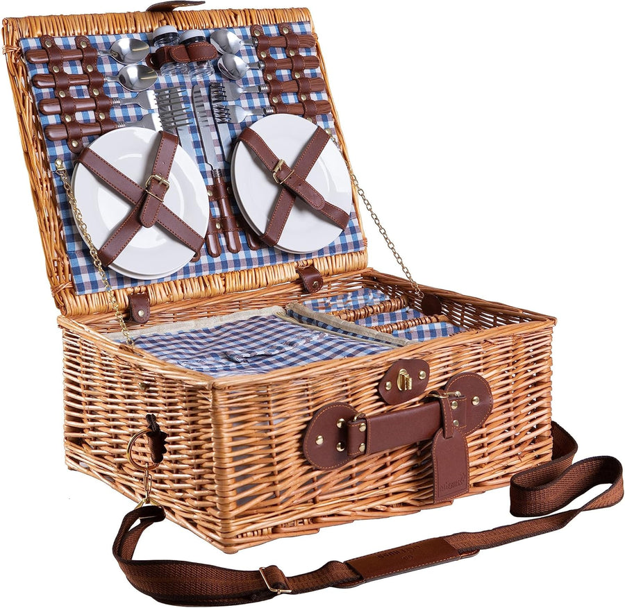 eGenuss Handgefertigter Picknickkorb für 4 Personen mit abnehmbarem Schultergurt, Kühlfach, Edelstah
