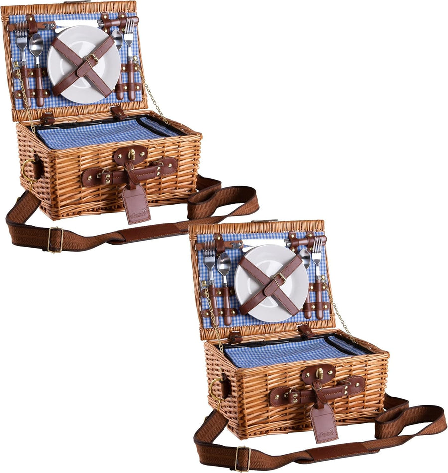 eGenuss 2er-Set handgefertigtes Picknickkorb für 2 Personen mit abnehmbarem Schultergurt, Kühlfach,