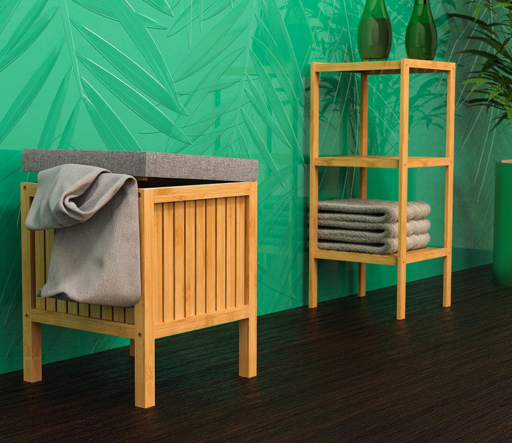 EISL BMBA02-WKBH Bambus Badhocker mit Wäschesammler, Wäsche Hocker mit Sitzfläche, Badezimmer Hocker