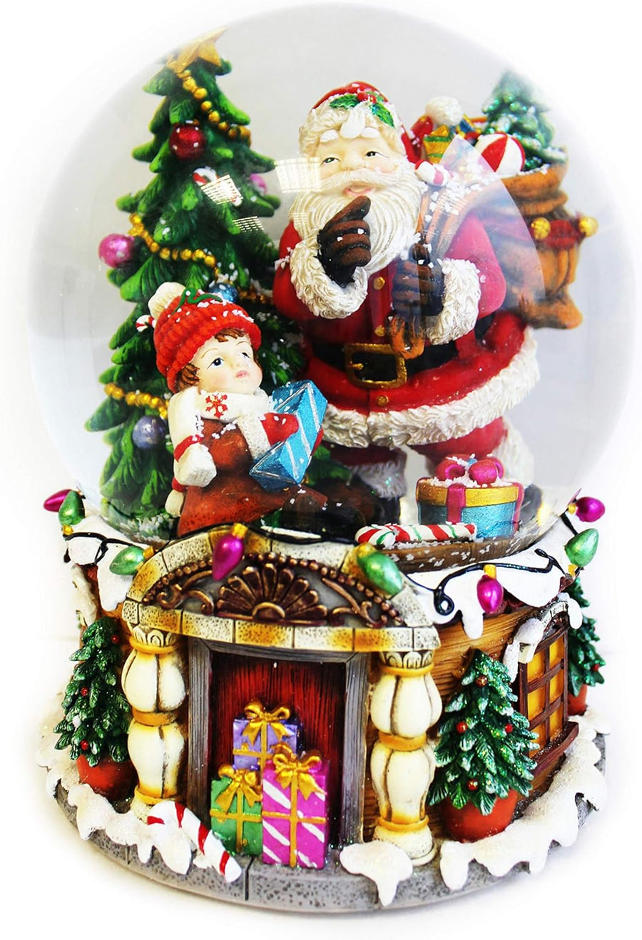 Schneekugel/Spieluhr 100mm mit Weihnachtsmann/Rentier– 14,5 cm Höhe, Mit Schneeflocken-Effekt und We