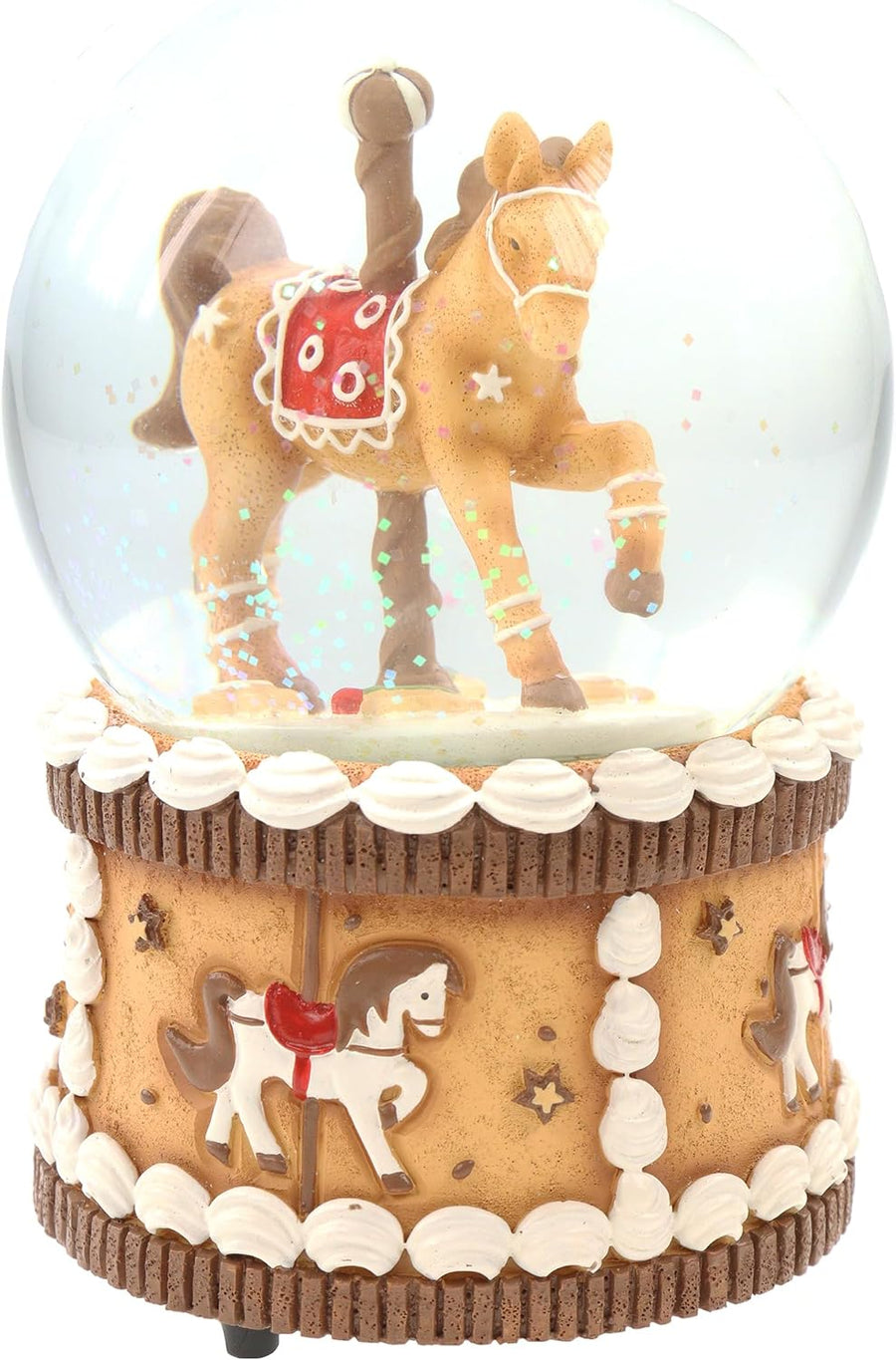 Schneekugel/Spieluhr Ø100mm mit drehendem Lebkuchenpferd auf Lebkuchensockel zum Aufziehen mit weihn