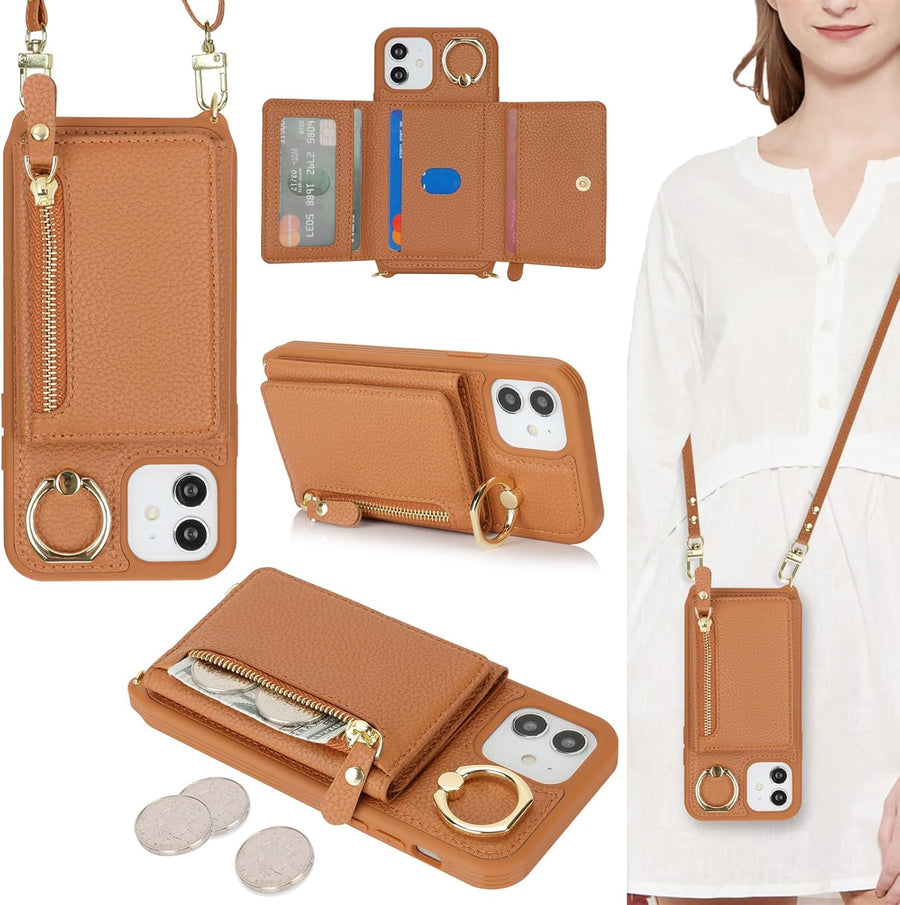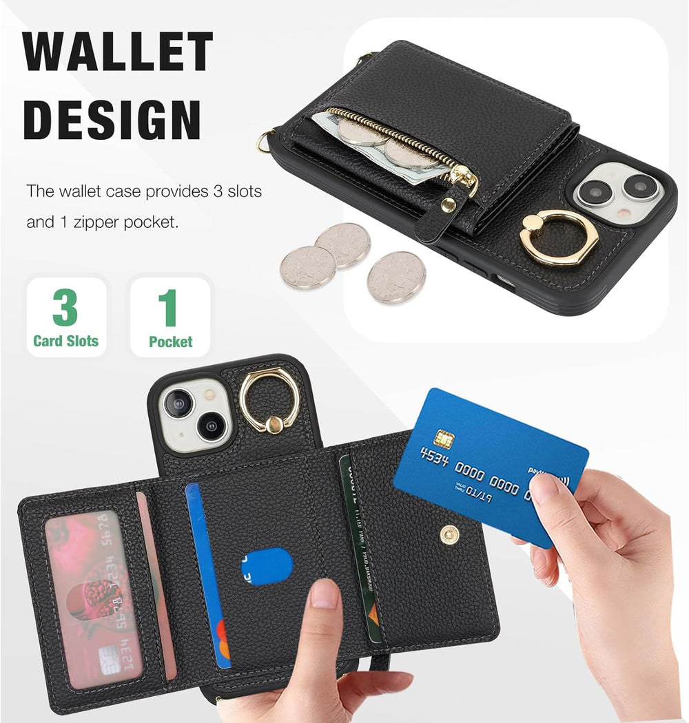 ELTEKER Handyhülle für iPhone 13 Hülle mit Band Kartenfach Handykette Ringhalterung Geldbörse,Leder