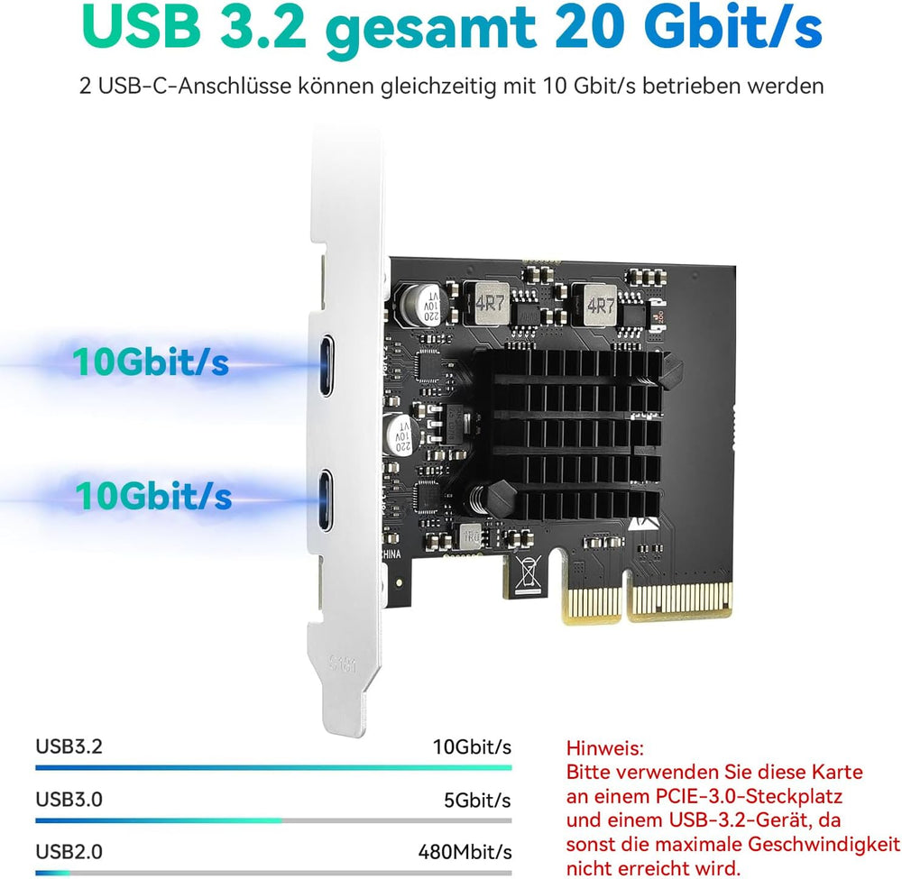 ELUTENG USB C PCIe Karte 2 Ports 2 x 10Gpbs, PCI Express PCIe X4 USB C 3.2 Gen2 Erweiterungskarte 20