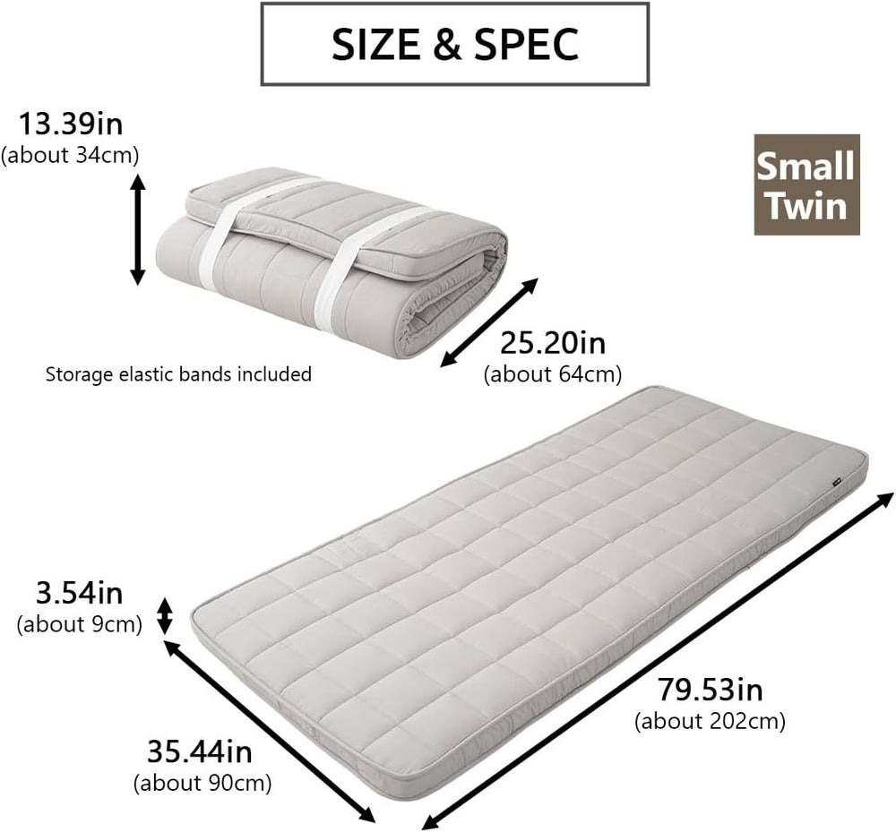 EMOOR Japanische Dreifach Gefaltete Futon-Matratze Machi mit Matratzenauflage 90 x 202 cm Grau, Zwic