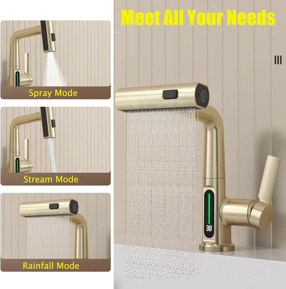 Wasserhahn Bad/Küche mit Ausziehbar Brause, LED Temperaturanzeige Waschtischarmatur Badezimmer mit 3