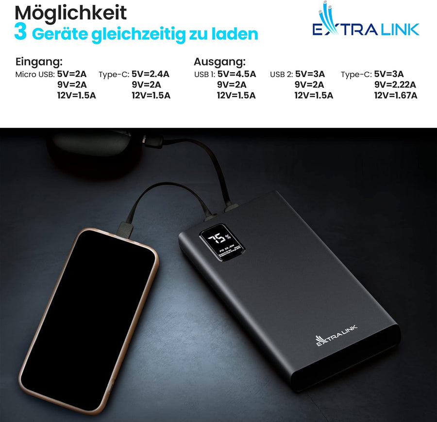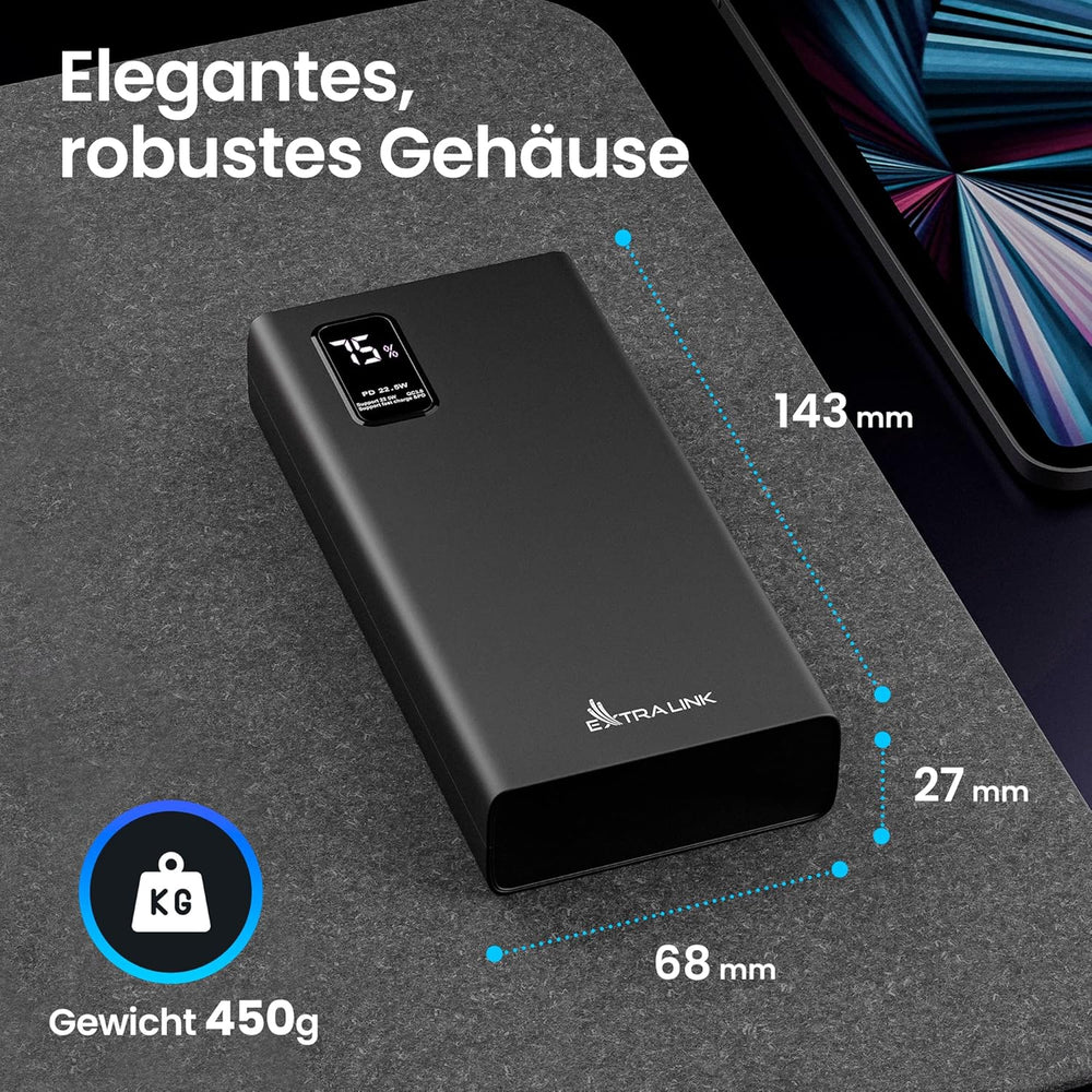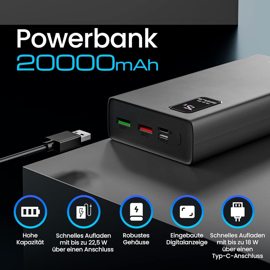 Powerbank 20000mAh Powerbank Schnellladefunktion bis zu 22,5W Power Bank USB C Micro-USB Robustes Ge