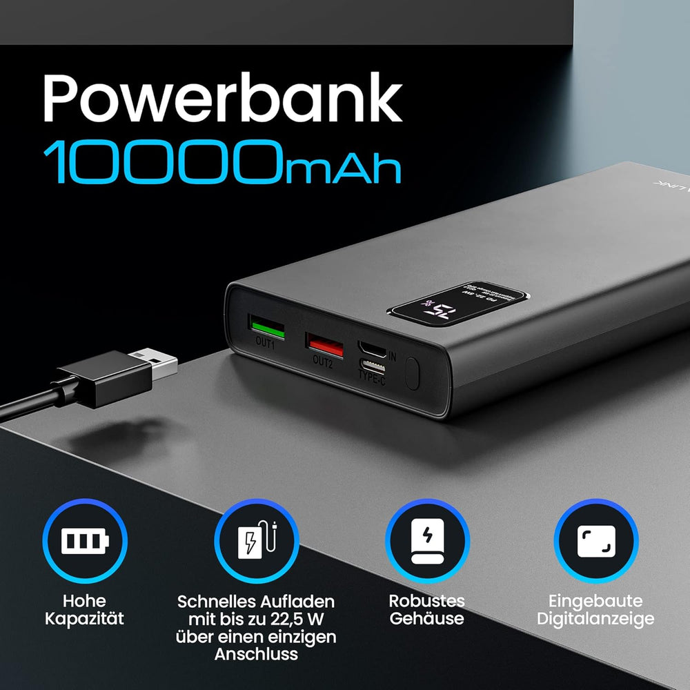 Powerbank 10000mAh Powerbank Schnellladefunktion bis zu 22,5W Power Bank USB C Robustes Gehäuse Lith