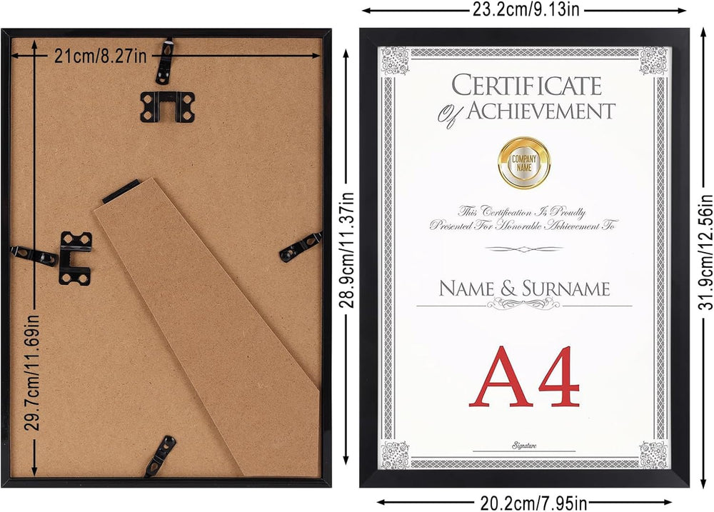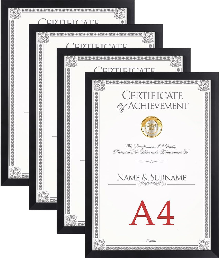 EXYGLO 4er Set Bilderrahmen DIN A4 (21x29,7 cm) - Schwarzer Rahmen für Fotos, Kunstwerke, Urkunden,