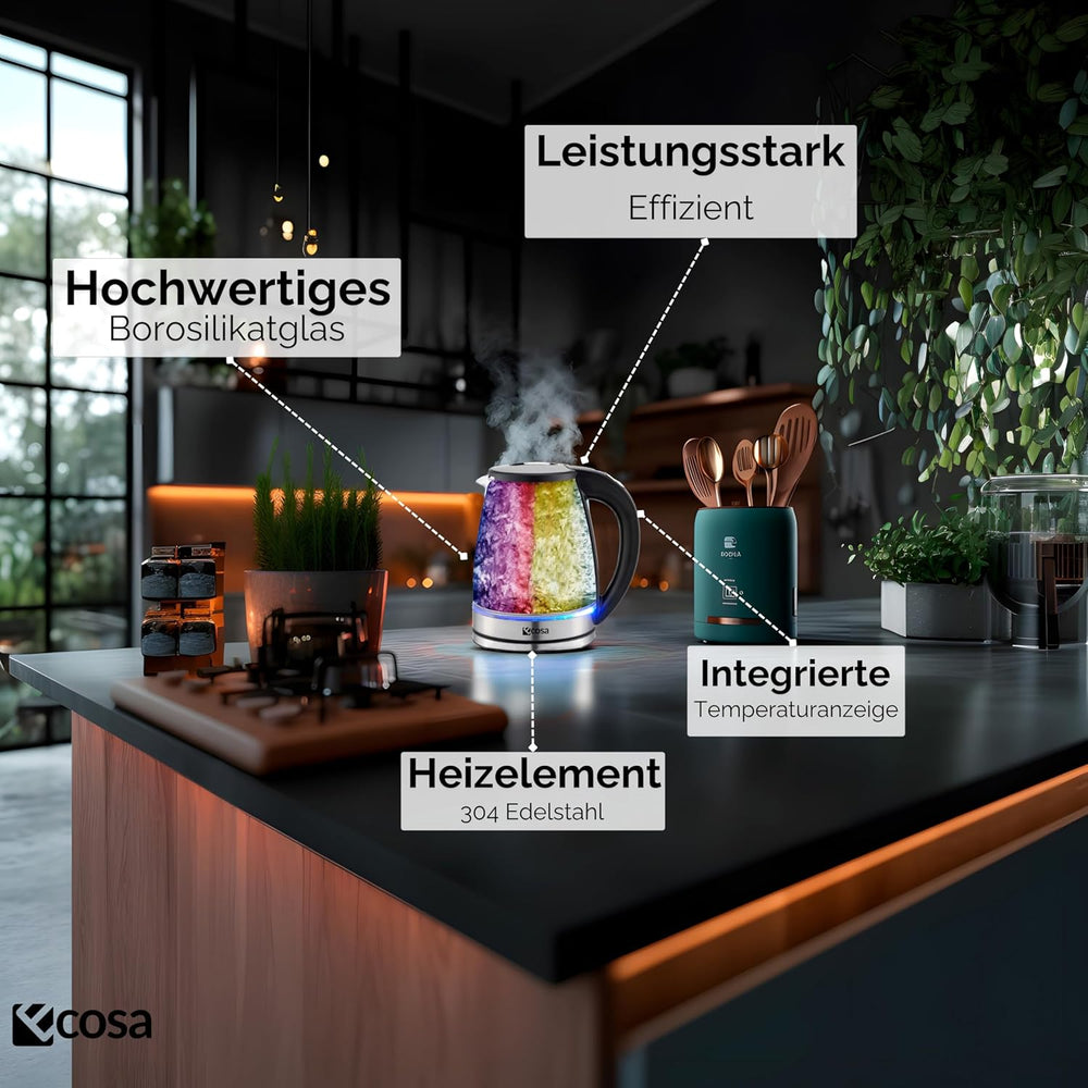 Glas Wasserkocher 1,8 Liter | 2200 Watt | Edelstahl mit Temperaturwahl | Teekocher | 100% BPA FREI |