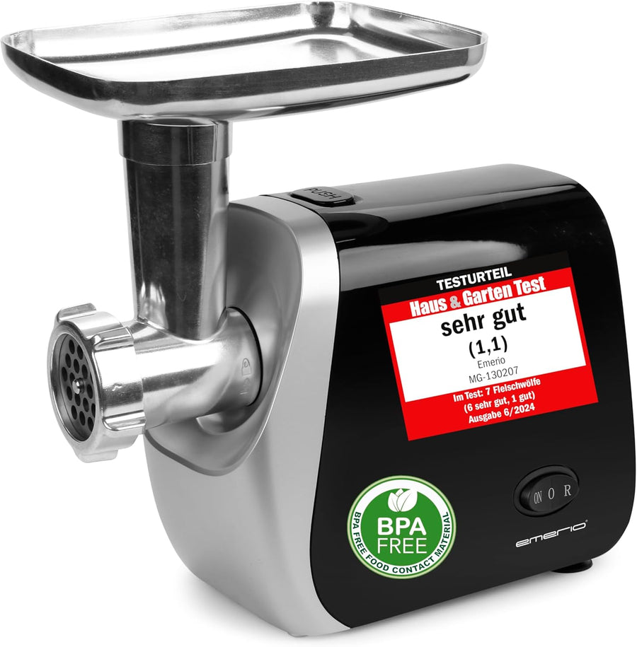 Emerio Fleischwolf | elektrisch | 3 Fleischeinsätze (fein/mittel/grob) + Wurststopfaufsatz + Kebbeau