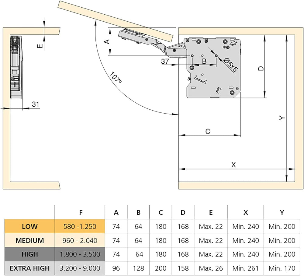 Emuca - Frontliftbeschlag für möbel Hubtüren, Komplettset für Klappenhöhen, stärke 950-2.350, Stahl
