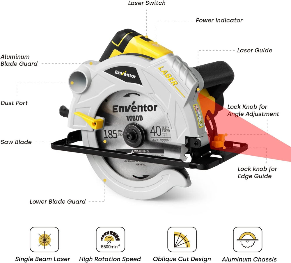 Enventor Mini Kreissäge 580W, Mini Handkreissäge mit Skalenlineal & Laserführung, 4000RPM, Einhändig