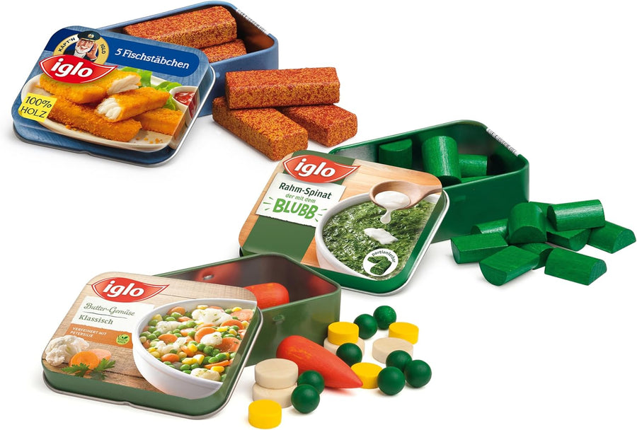 Erzi 06006 Tiefkühlsortiment von Iglo aus Holz, Kaufladenartikel für Kinder, Rollenspiele.