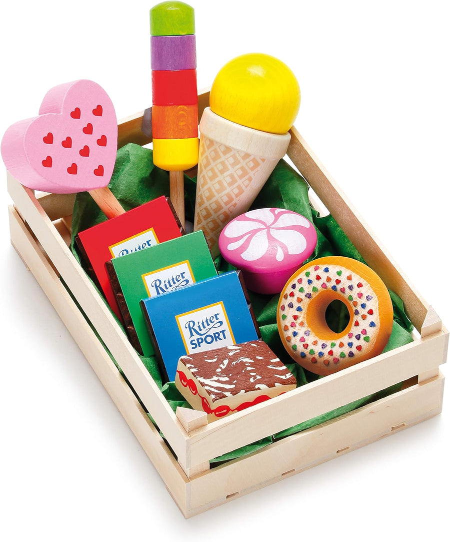 Erzi 28135 Sortiment Süsswaren aus Holz, Kaufladenartikel für Kinder, Rollenspiele