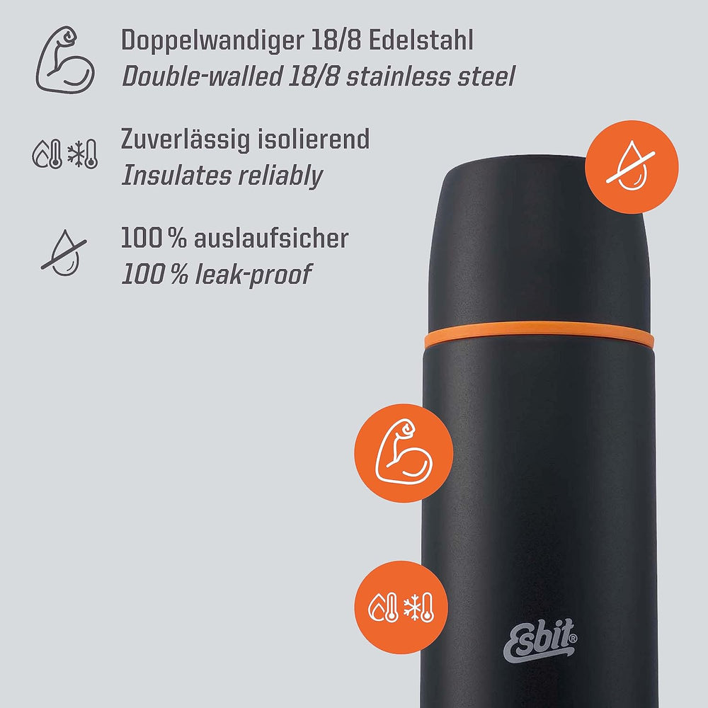 Esbit Edelstahl Isolierflasche Classic 1000 ml in Schwarz - für warme und kalte Getränke - Edelstahl